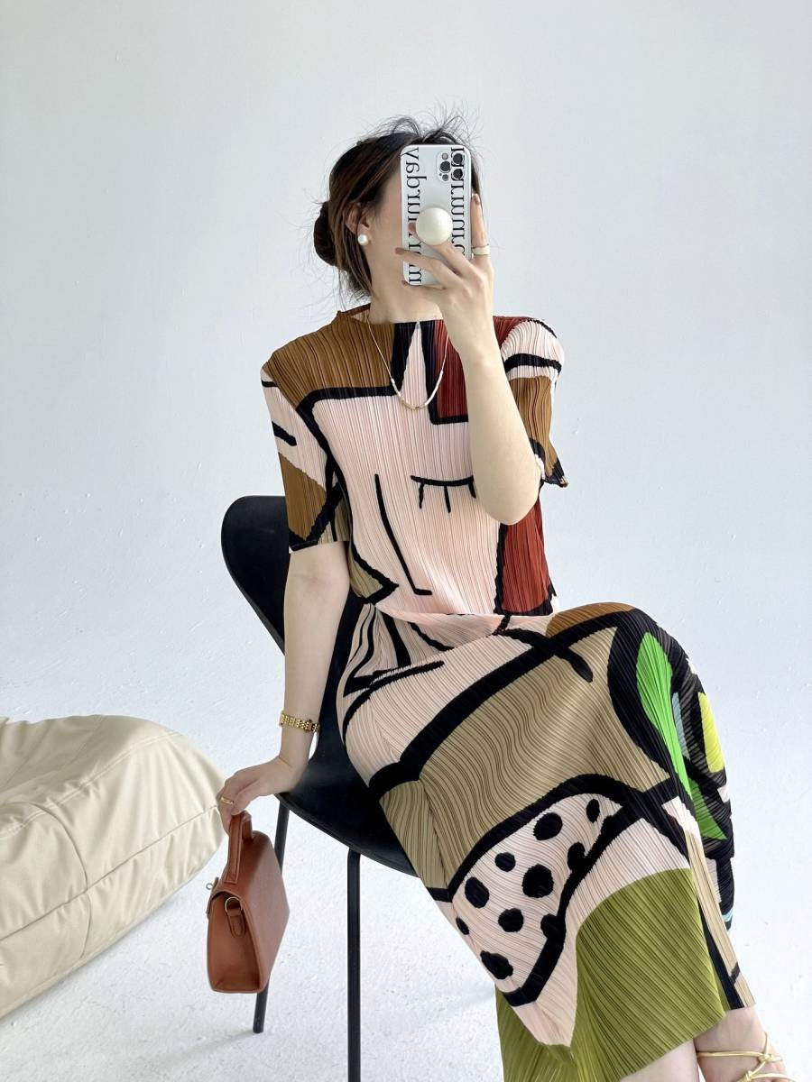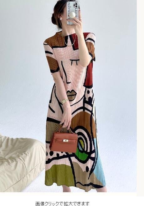 新品  レディーストップス プリーツワンピース チュニック 半袖 弾力がありドレープ性いい 素敵柄ブラウン Q057