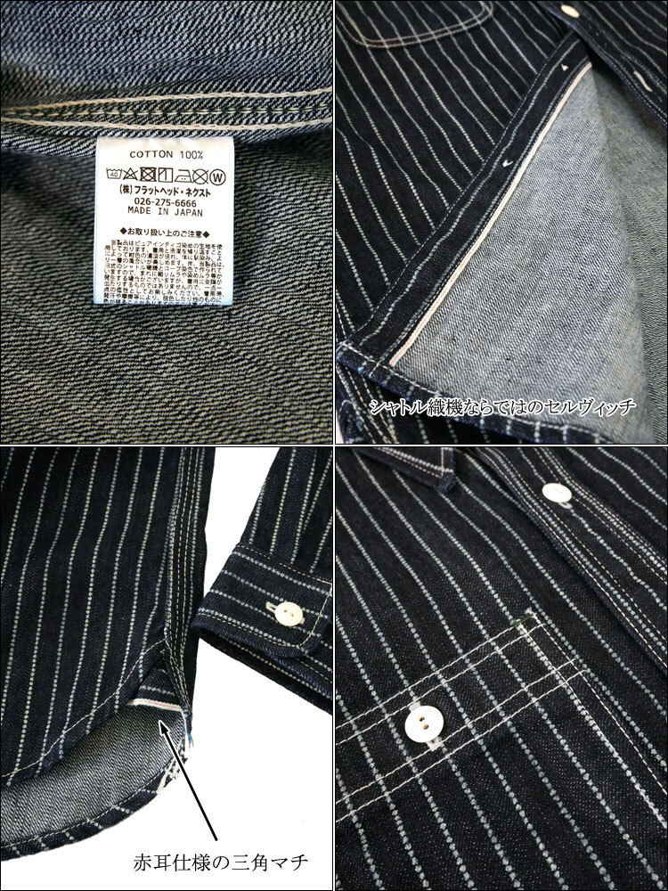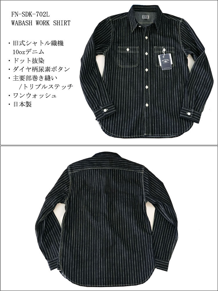 ジーンズ、Tシャツ、スウェット等、古き良き時代のアメリカンテイストを 継承しつつ、現在の素晴らしい所を融合させる本格ブランド“フラットヘッド” アメカジの王道といっても過言ではないほどの高い評価を受けているブランドです 新品 送料無料 The FLAT HEAD WABASH WORK SHIRT 10オンスデニム ウォバッシュ ワークシャツ FN-SDK-702L フラットヘッドの定番アイテム「デニム ワークシャツ」 デニム生地に抜染によるドットストライプを施しています 常に人気のある究極のデニムシャツです! シャトル織機で織り上げた10オンスデニムは、しなやかな着心地で フラットヘッドデニムの特濃色でハッキリとしたタテ落ちが楽しめます デザインと機能性を併せ持つハイクオリティ デニムシャツ 1度着るとやみつきになり非常に重宝する万能アイテムです! ・旧式シャトル織機10ozデニム ・尿素ネコ目ボタン ・ドット抜染 ・主要部巻き縫い/トリプルステッチ ・ワンウォッシュ ・コットン100% ・日本製