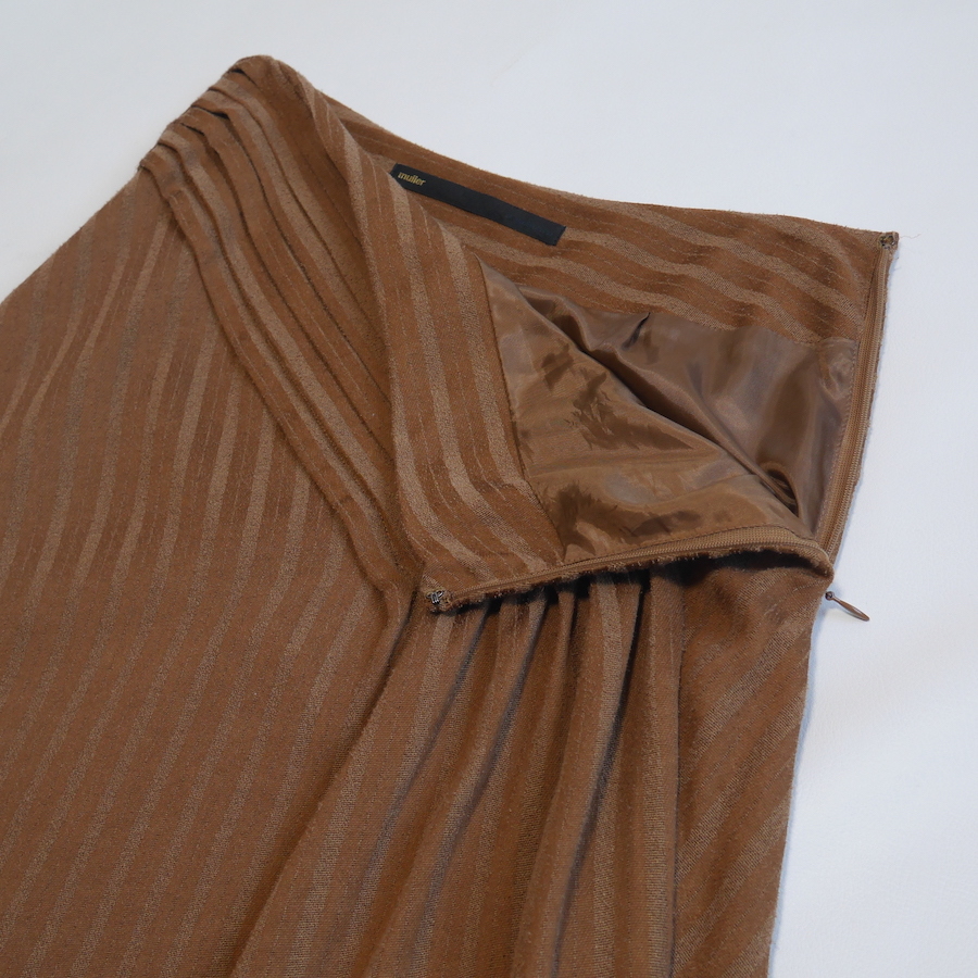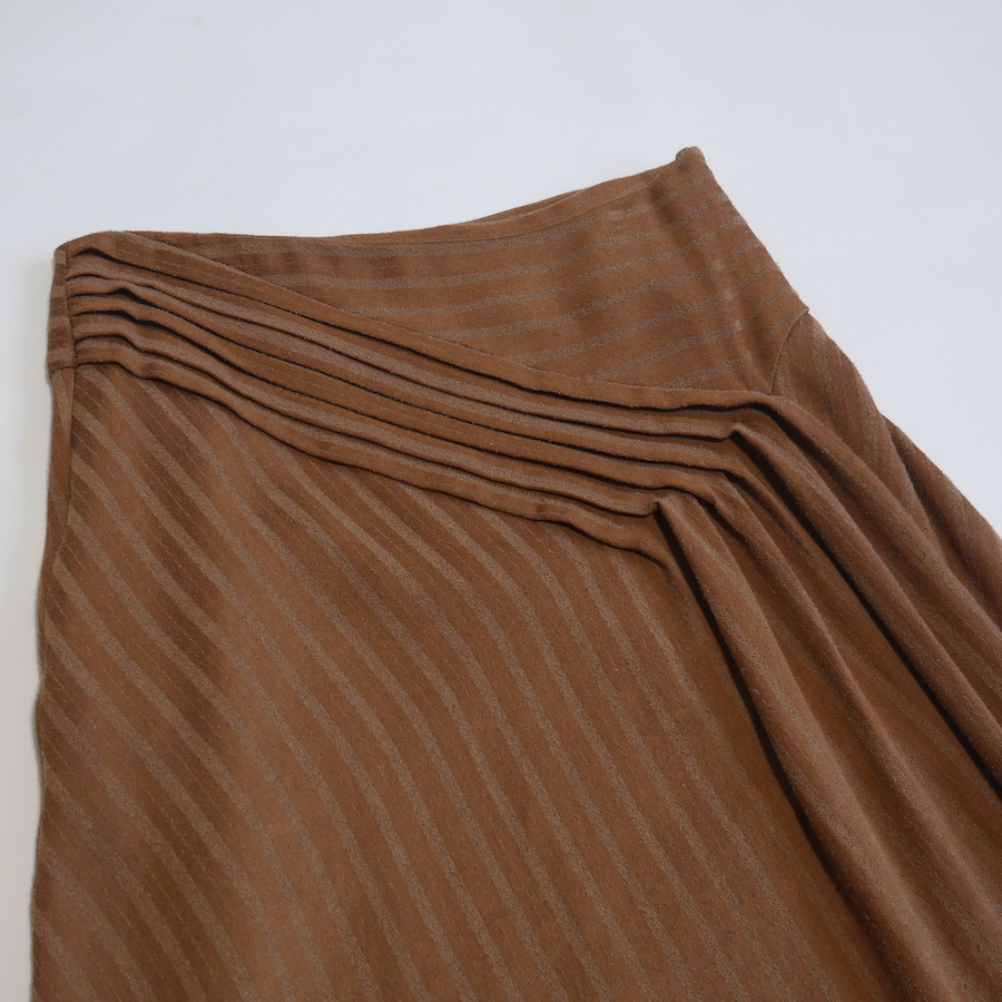 ドライタッチのロングスカート。 よく見ると斜めにストライプが入っており、すっきりとした印象。 腰あたりからのギャザー切り替えがポイントになり目を惹くアイテムです。