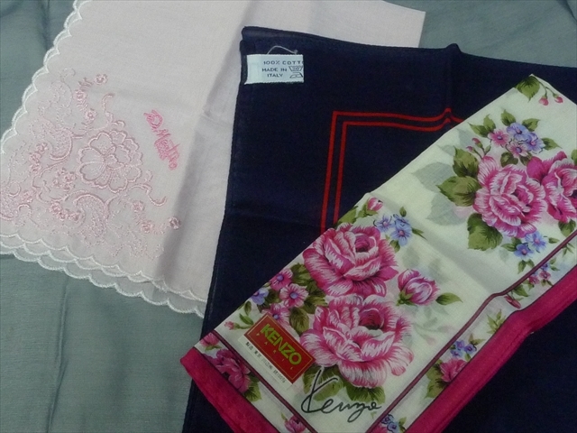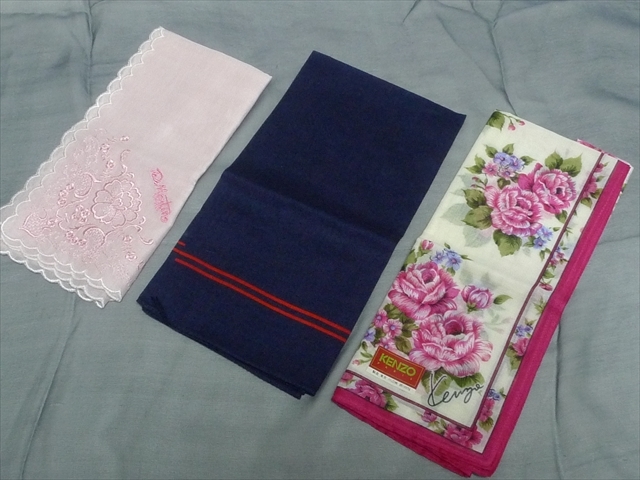 ハンカチ 3種ハンカチーフセット 3枚 未使用品です。 ・色柄がきれいです。 ・大きさ(約)、その他 1--- ピンク 36×36cm 2--- 紺色 42×42cm 100% コットン MADE IN ITALY 3--- KENZO(花柄) 44×44cm 綿100% 日本製 ・発送方法は、レターパックライト又は定形外郵便予定しています。 | ||