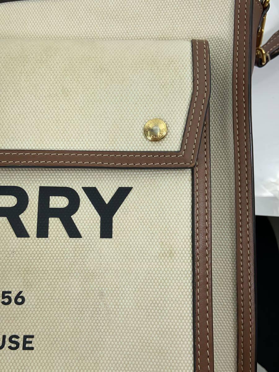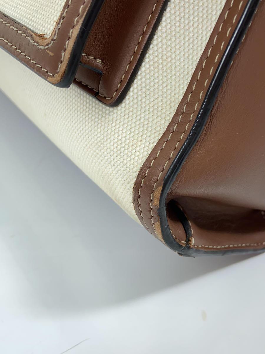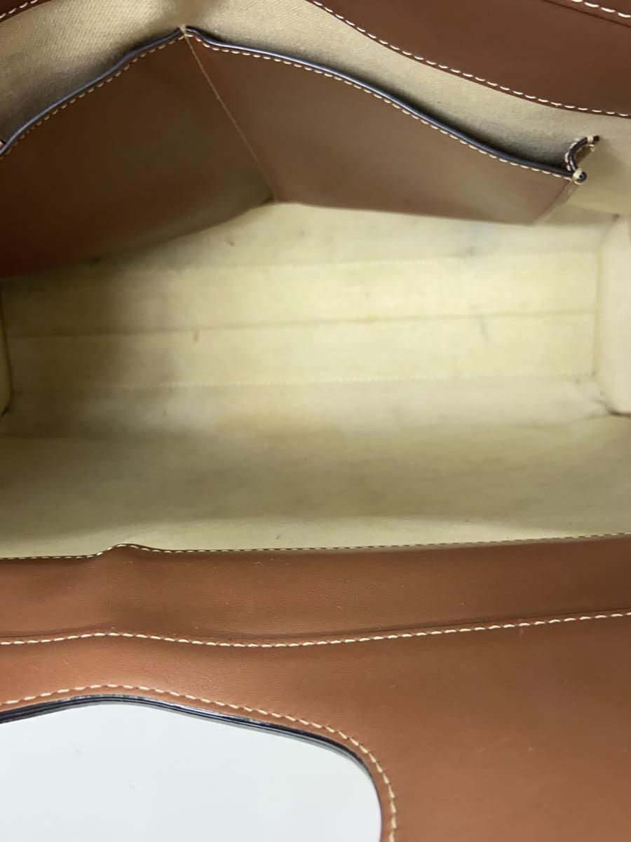 キャンバス生地にシミ汚れがございます。角スレ、ゴム部分に剥がれが御座います。内側にも汚れあり、全体的なの使用感がございます。 |