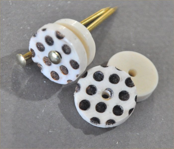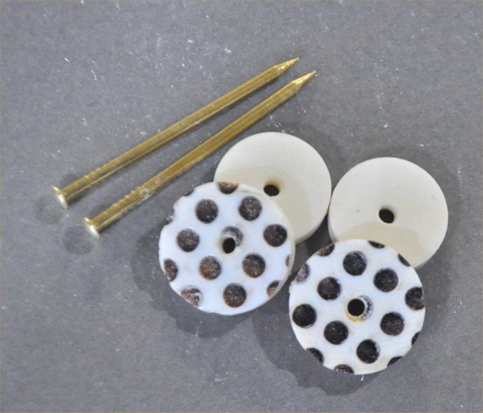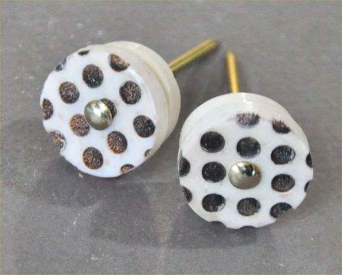 ナンタケットバスケット用のマンモス牙のレーザー彫の水玉模様のノブ18mmサイズは18mm径厚み4,5mm ワッシャー16mm径厚み4mmマンモス牙にレーザー彫で水玉模様を彫ったノブで擦れて取れることはありません。水玉の黒色はマンモス牙のアイボリー色が炭化した色模様です。