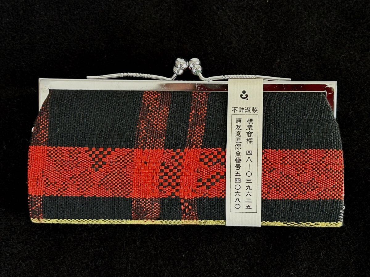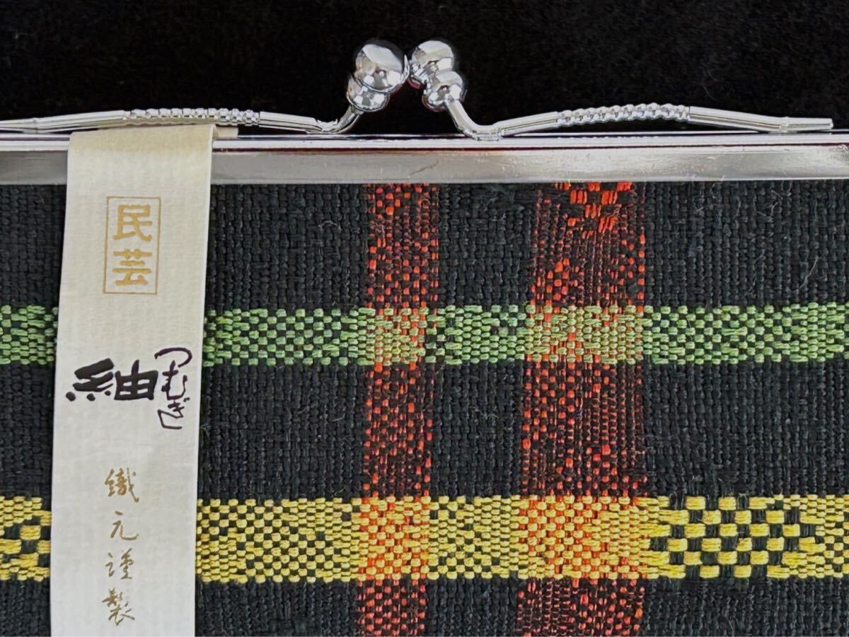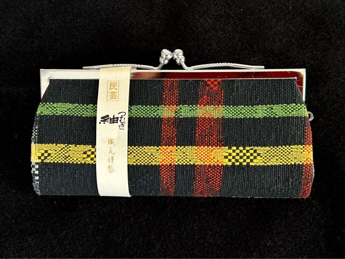 ・がま口金具のデザインが、華奢でお洒落な紬のがま口財布(織元謹製)です。織物も黒ベースに赤、緑、黄の格子が品良くどこか可愛らしさがあると思います。
