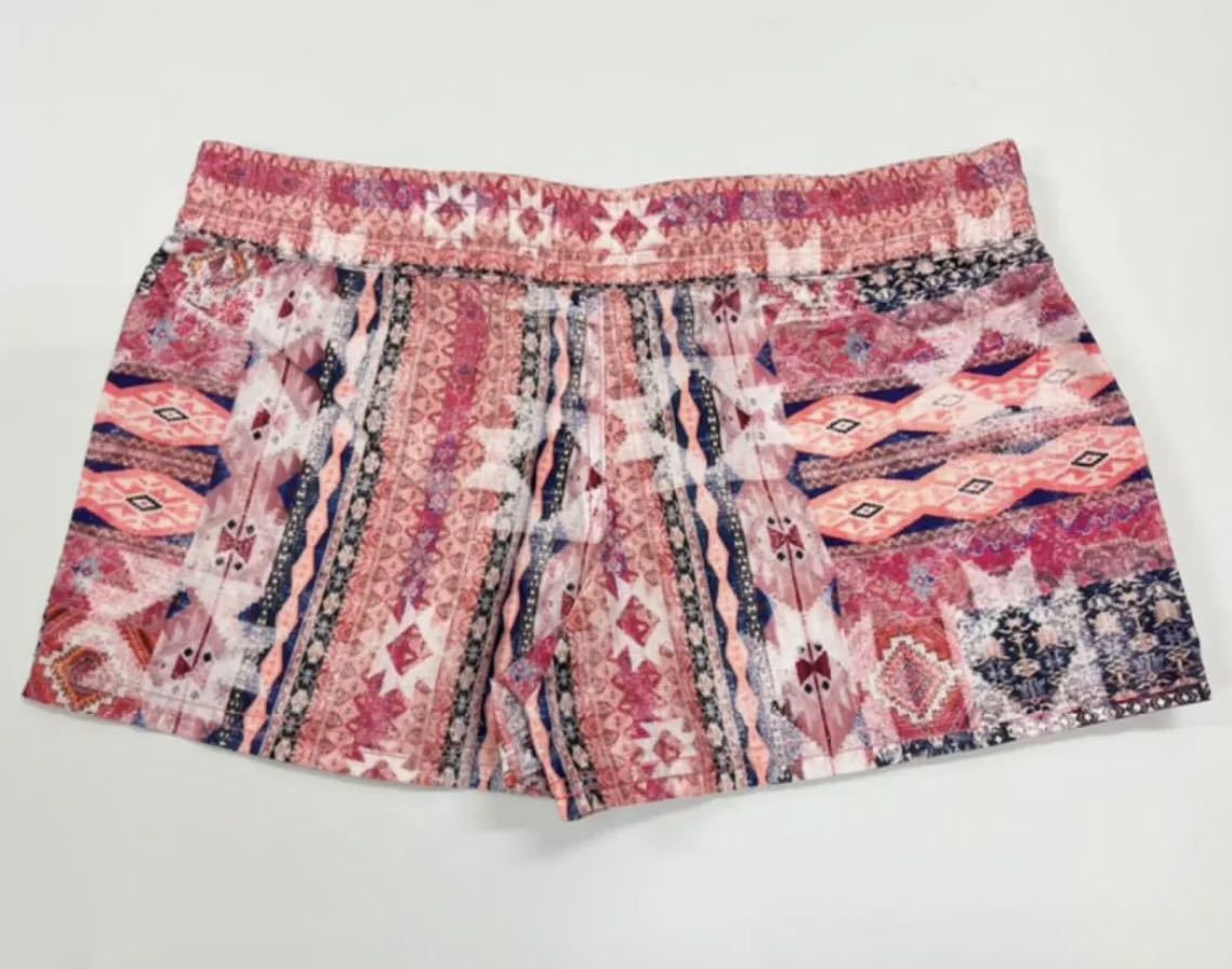 ■パステルカラーが斬新なオルテガ柄素材を使用したレディースショート丈ボードショーツ。