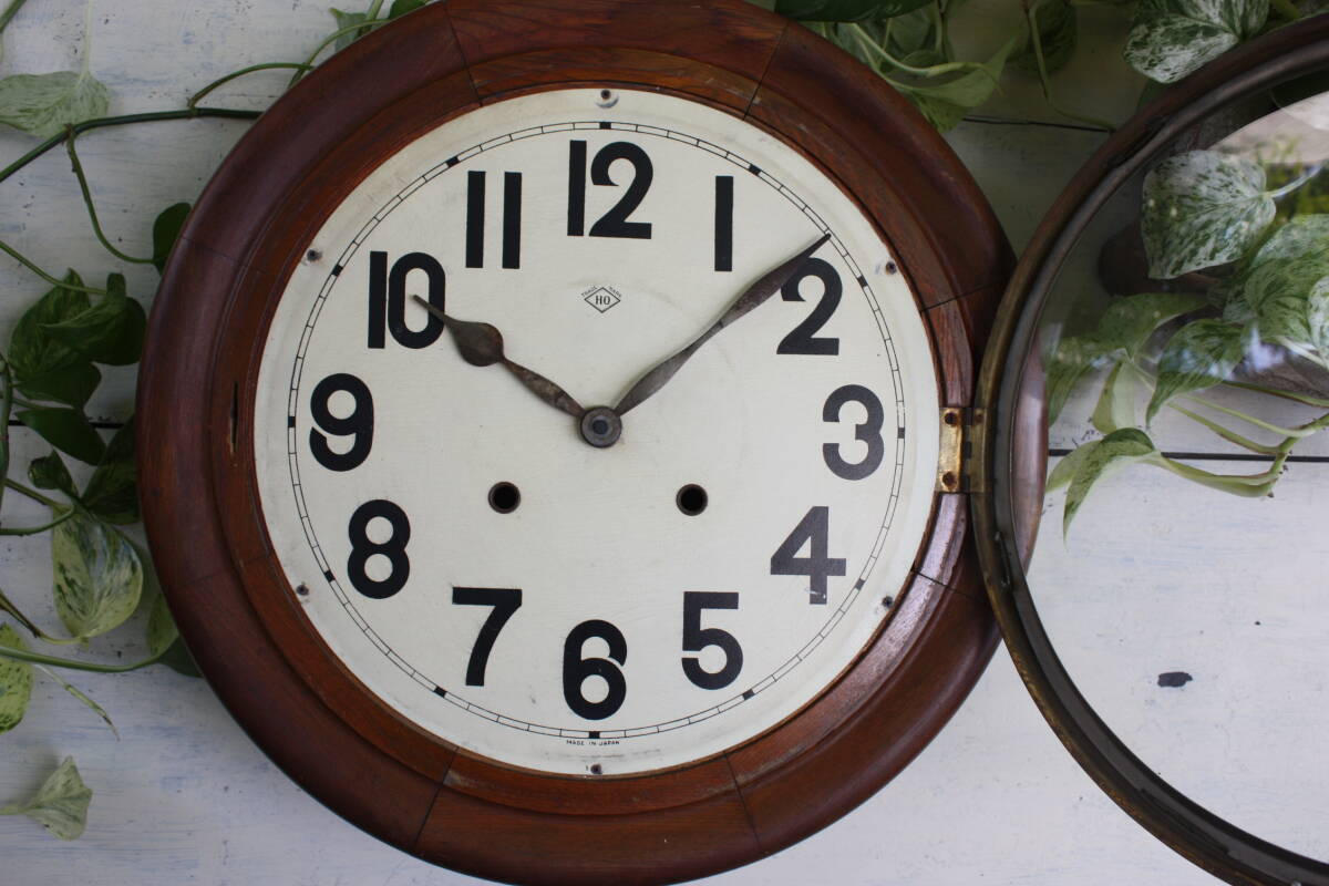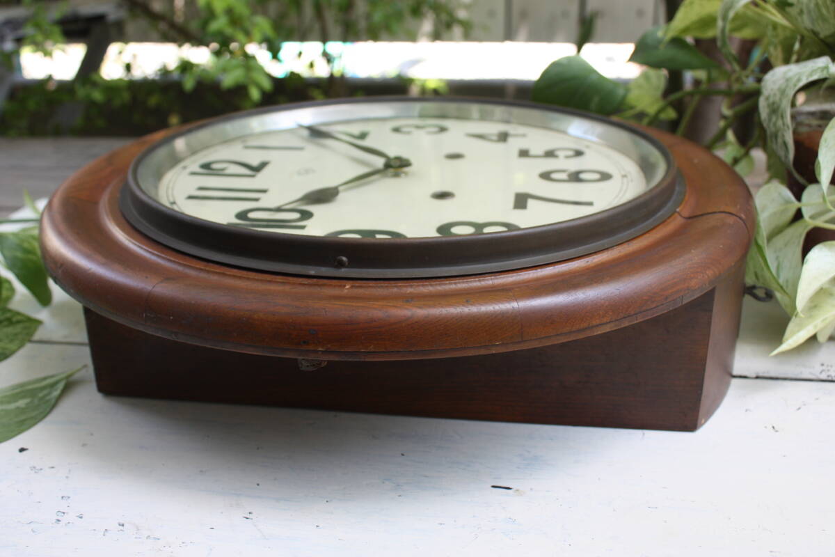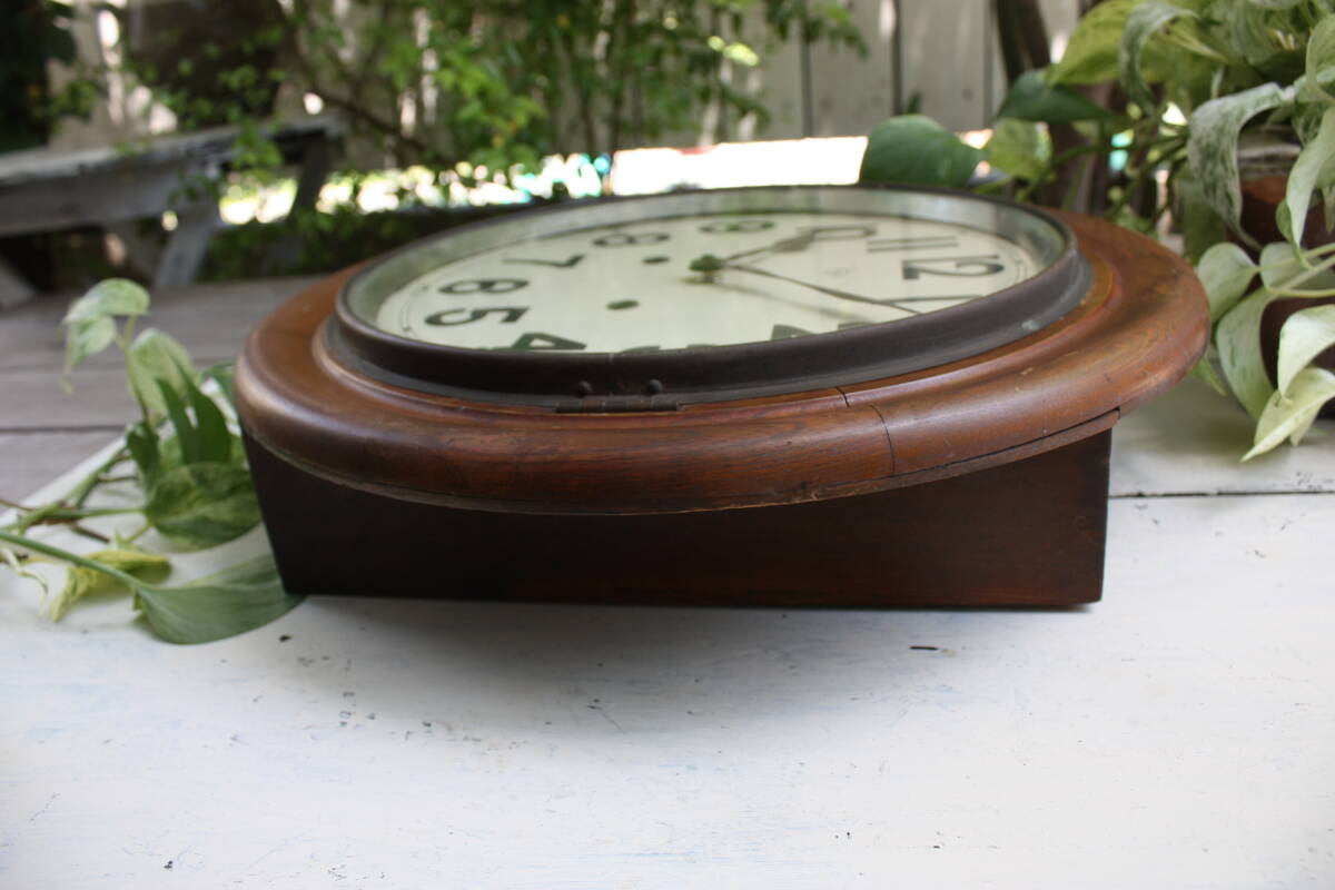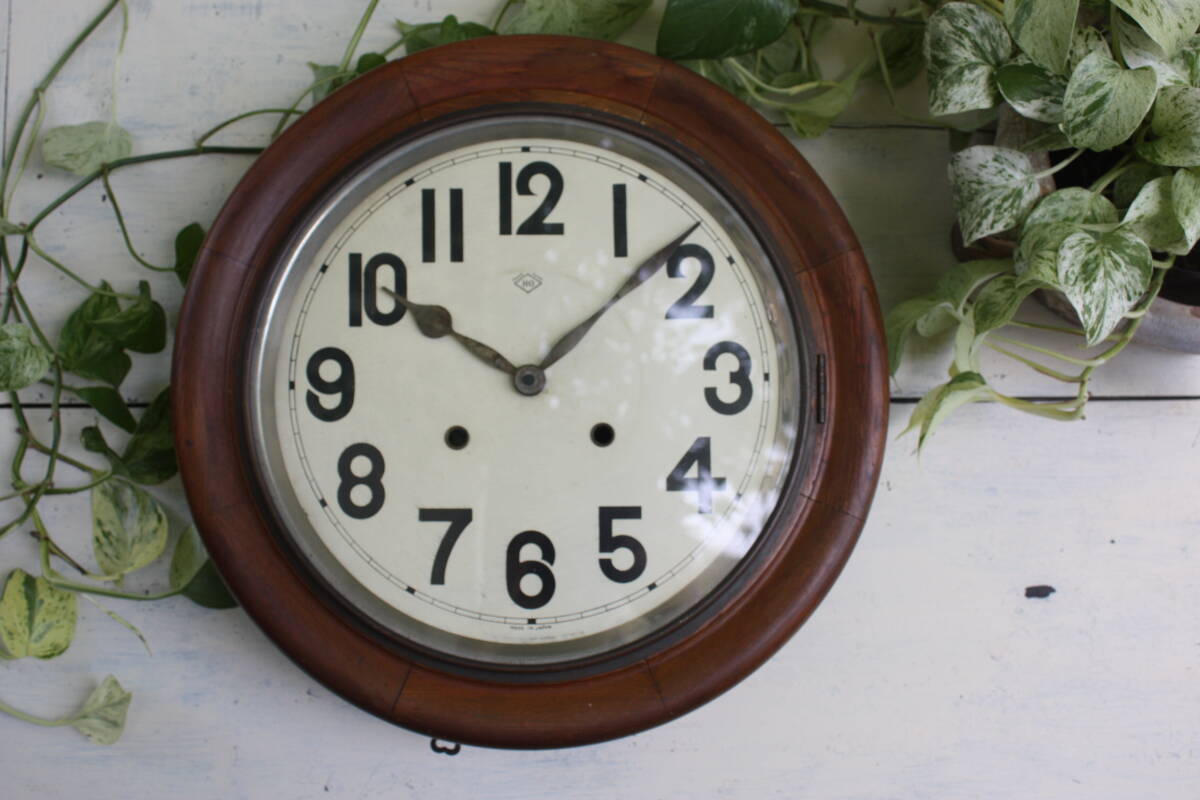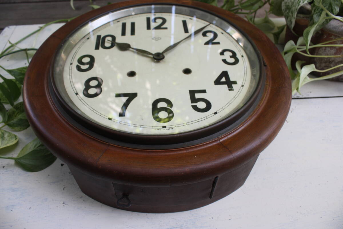 静音 アンティーク 丸型 時計 電池式 クオーツ改造 ゆらゆらガラス 動作品 レトロ 丸形 丸 古い 希少 茶 スイープ 誠時