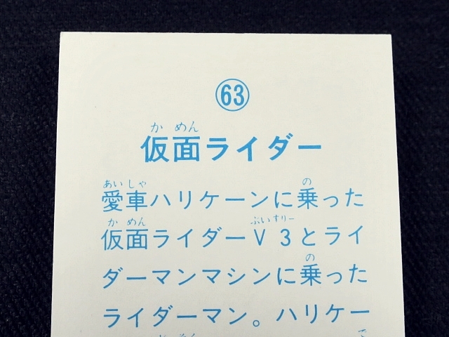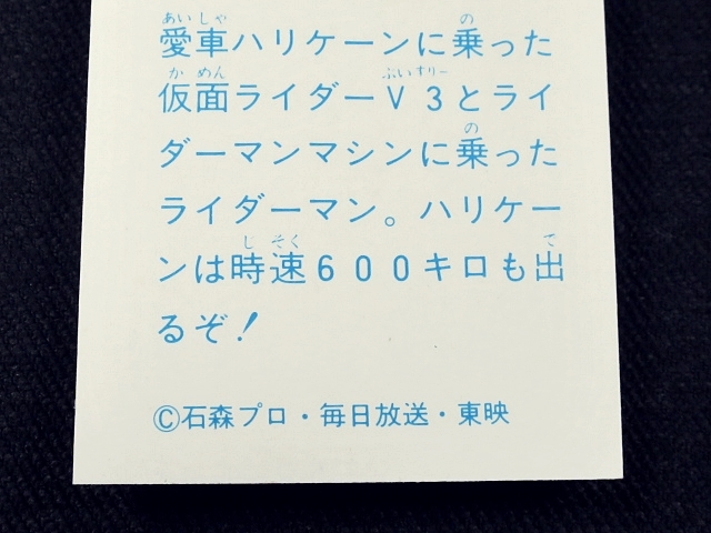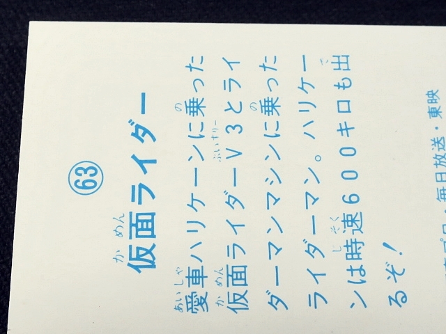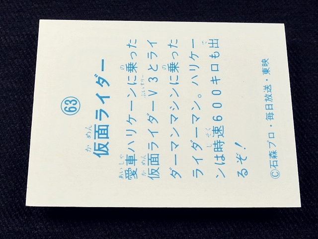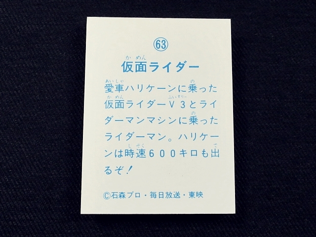 仮面ライダー ミニカード 70年代 1枚 バラ売り ・メーカー:山勝 ・ 6.6 cm x 5.0 cm (裁断により若干誤差有り) ・1978年前後、ストロンガー放送後~スカイライダー放送頃、主に駄菓子屋にて発売 ・発送方法の規格内範囲にて同梱可能。 ※全256種シリーズ (1-232、233欠番、234-257はレア番) ・1弾(001-064)64種 ・2弾(065-128)64種 ・3弾(129-168)40種 ・4弾(169-232)64種 ・5弾(234-257)24種 ・アルバム:全15種 〓参考項目〓 ◎キャスト ・本郷猛 / 仮面ライダー1号:藤岡弘 ・一文字隼人 / 仮面ライダー2号:佐々木剛 ・風見志郎 / 仮面ライダーV3:宮内洋 ・結城丈二 / ライダーマン:山口暁 ・神敬介 / 仮面ライダーX:速水亮 ・山本大介 / 仮面ライダーアマゾン:岡崎徹 ・城茂 / 仮面ライダーストロンガー:荒木茂 ・暗黒大将軍:堀田真三 ・ナレーター:中江真司 ・立花藤兵衛:小林昭二 ◎スーツアクター ・中村文弥 ・岡田勝 ・中屋敷鉄也 ・池田力也 ・河原崎洋夫 ・新堀和男 ・前田直高 ・湯川泰男 ・上田弘司 ・橋本春彦 ◎原作:石森章太郎 ◎連載:テレビマガジン、たのしい幼稚園、冒険王、テレビランド | ||