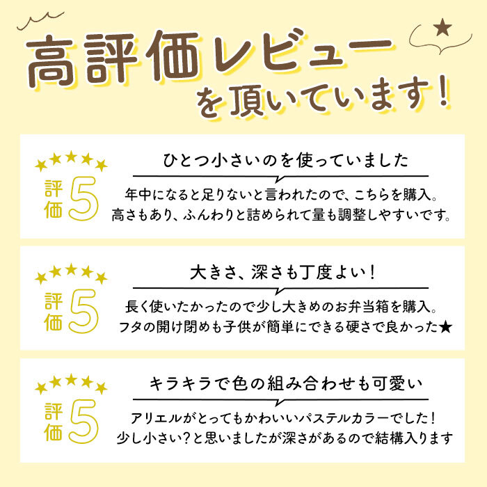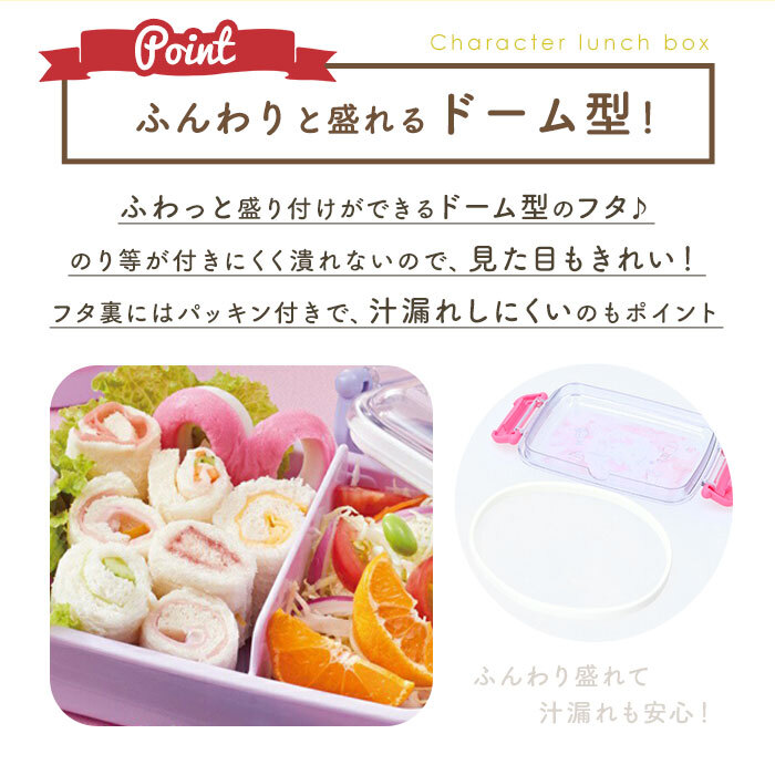 | 商品説明 | ・・ふわっと盛り付けができるドーム型のフタがポイント♪お弁当が可愛く「映える」ランチボックス。 ・のり等がフタにくっつきにくく押し潰れも防ぐので、見た目もきれい!フタ裏にはパッキン付きで、汁漏れしにくいのも嬉しいポイント。 ・おかずが片寄りにくい高い仕切り付き。 ・お弁当箱の容量は450ml。お弁当箱1/2に入るご飯の量は、お茶わん約1.1杯分。(※お茶わん1杯分を約200mlとして算出しています。) ・抗菌効果のある材質を使用しているから、ママも安心。(※抗菌加工を施しておりますが、すべての細菌の増殖を抑制するものではありません。) ・うれしい食洗機対応・フタを外して電子レンジもOK! ・お名前シール付きなので、お友だちのお弁当箱との取り違えを防げる◎ |