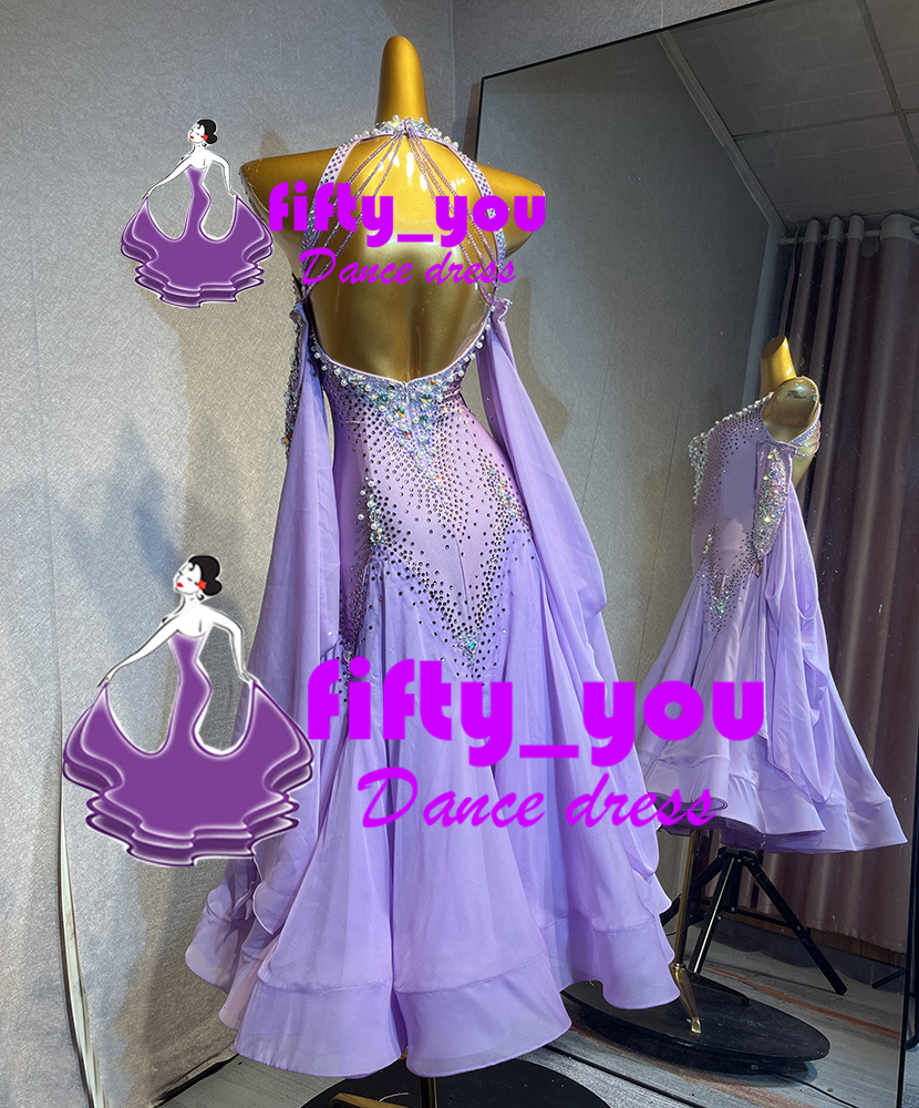 新品fifty_youオリジナルデザイン レディース社交ダンスドレス サイズオーダー モダン競技パーティドレス ワルツドレス 紫色 石飾り