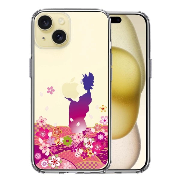 iPhone15 ケース クリア 日本女性 着物少女 青紫 スマホケース 側面ソフト 背面ハード ハイブリッド