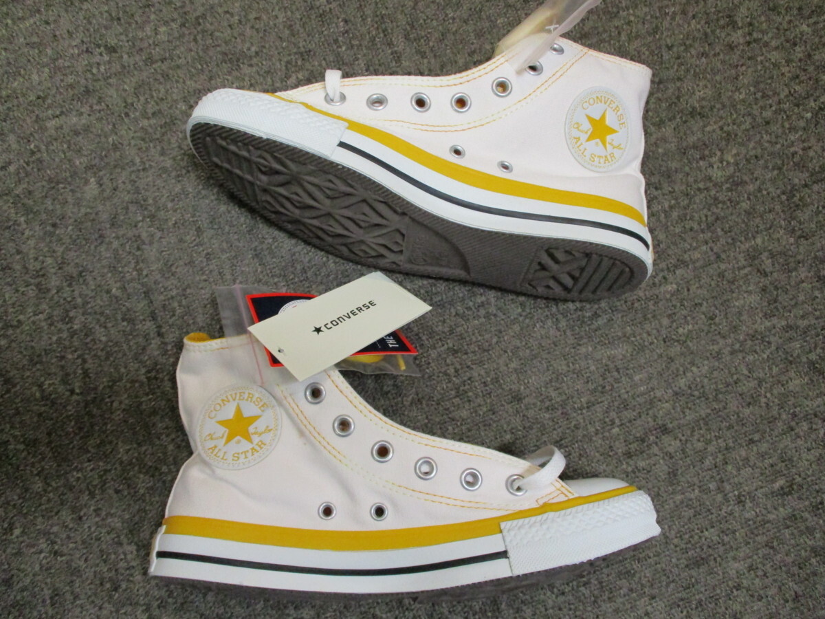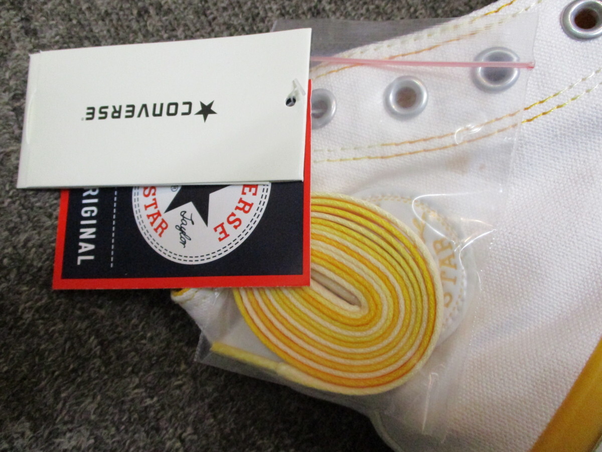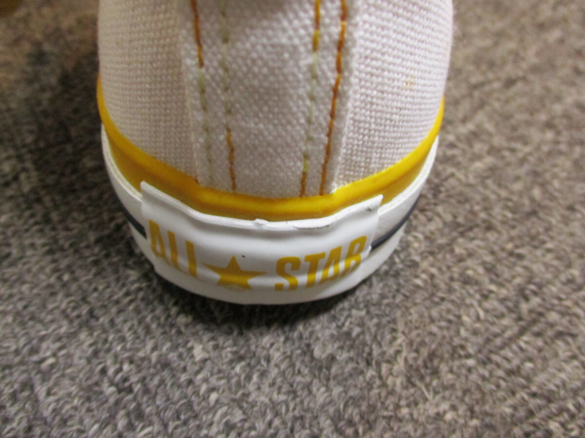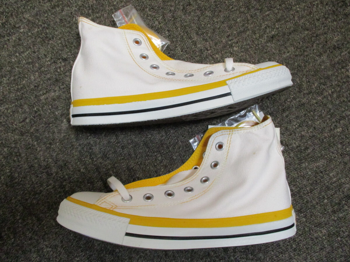 未使用のコンバース オールスターです。 未使用買取品になりますので一度人の手に渡った商品になります。 上記ご理解頂ける方のみご入札ください。 未使用ですが白ベースなので少しシミみたいなものがあります。(画像確認) お色目はホワイトベースにイエロー系です。 靴ひもが2種類付いています。 ご不明な点はご質問の上、画像をよくご覧の上NC/NRでお願い致します。 |