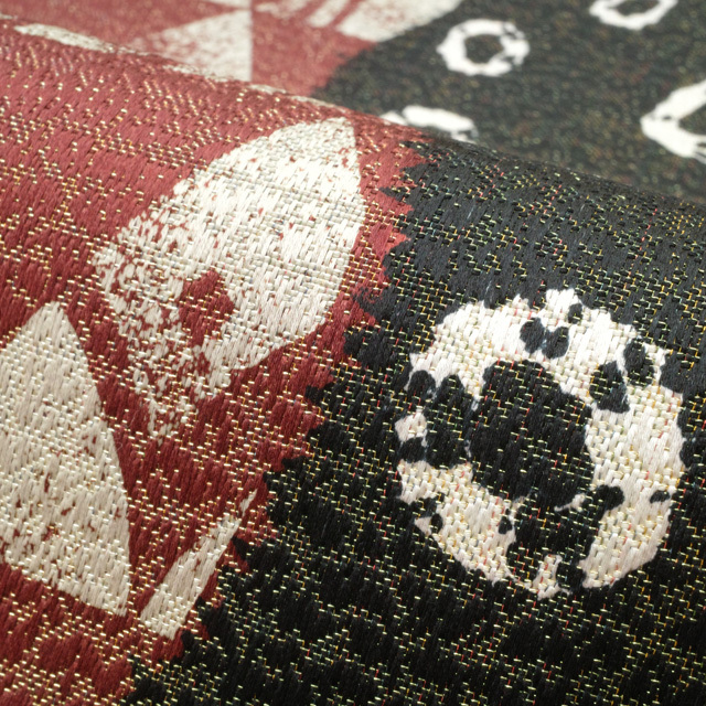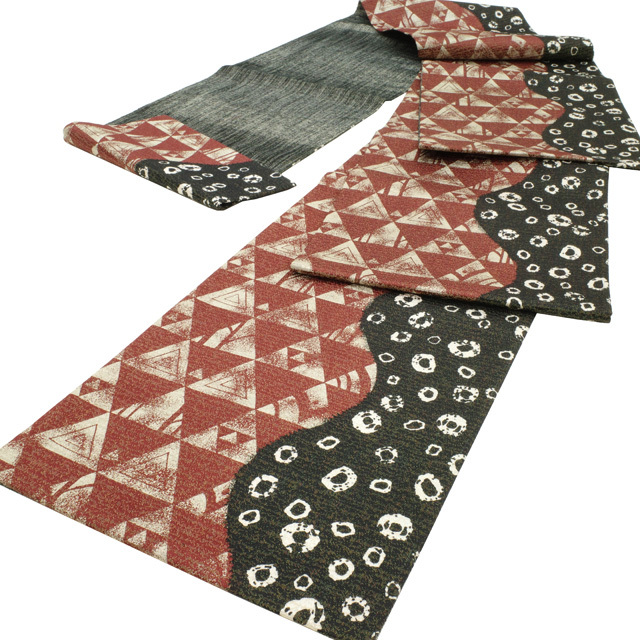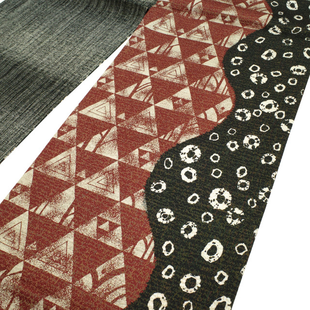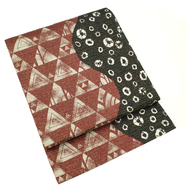 【新品】 すごい値! 袋帯 未使用 全通 京都 西陣 村田織物 正絹 赤茶 × 黒 織り分け地 モダン 丸文 鱗 珍しい柄行 カジュアル 仕立て上がり 春 秋 冬 袋帯 未使用 普段着 お出かけ 観劇 お食事 ショッピング などのカジュアルシーンに 販売 購入 綺麗 美品 たとう紙付き 送料無料 すごいね みやがわ neb01010