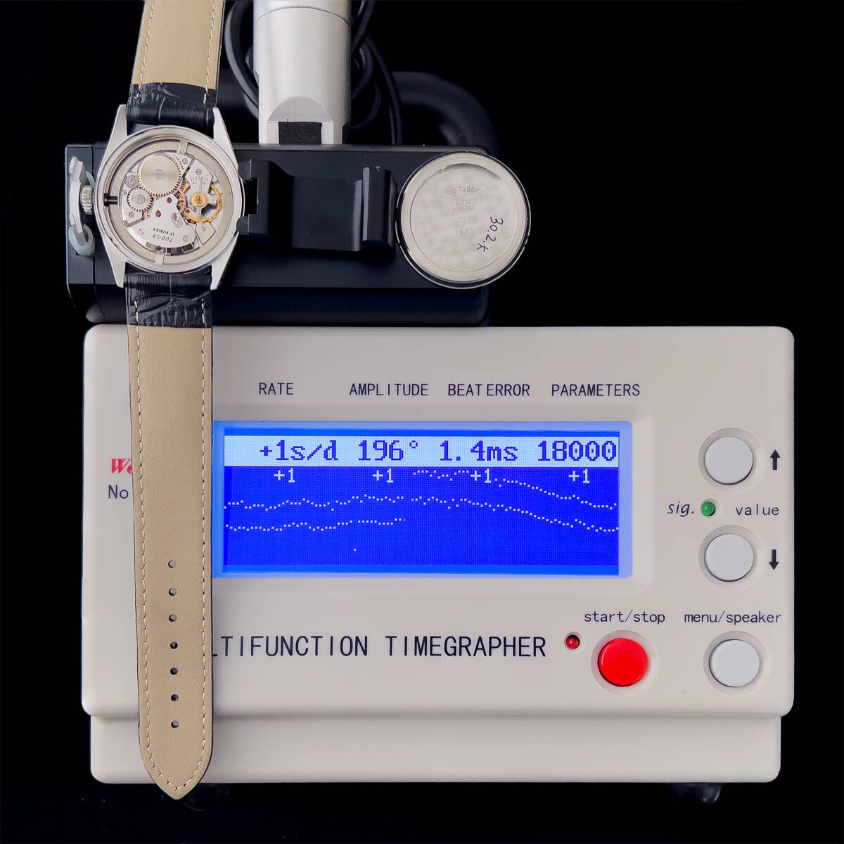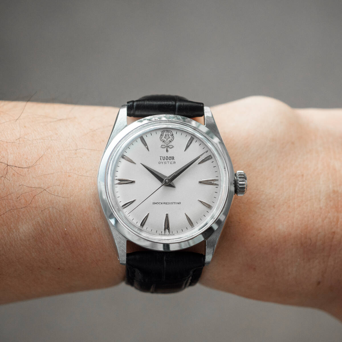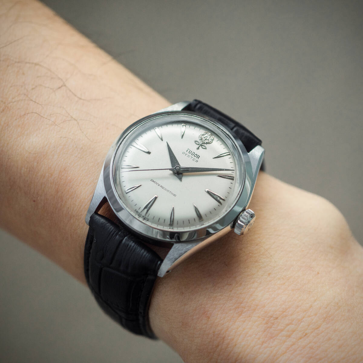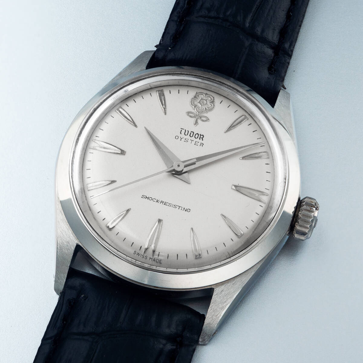 ※全て現物の写真です。 【概要】 1960年代に製造したチュードルの超人気モデル・オイスター デカバラの手巻き時計です。 【ポイント】 ダイヤルは大変いいコンディションです。12時にゴールドのデカバラ、インデックス、針を使用しています。マットホワイトとシルバーの組み合わせが大変珍しいです。1970年に盾のマークに変わるまで30数年しか作られていないため希少性が高いモデルです。 ケース、リューズはロレックス社と共有しており、クラウンマークが入ります。 | |||
