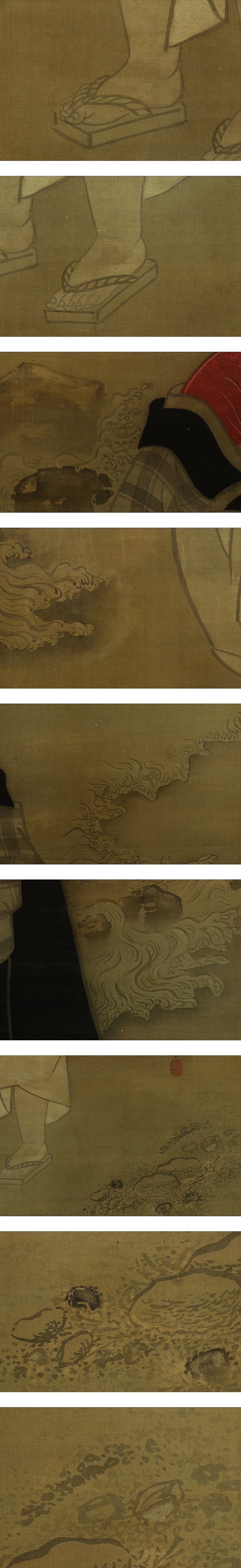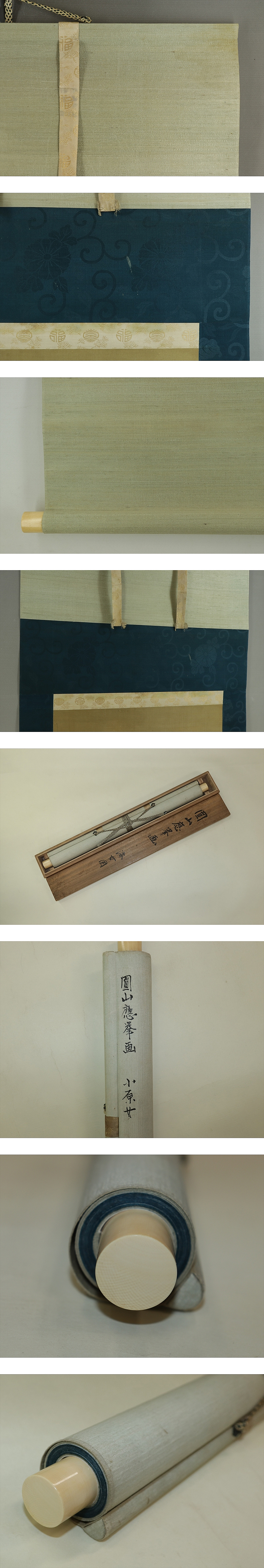 円山応挙 まるやま-おうきょ(1733-1795) 江戸後期の画家。円山派の祖。丹波生。 字は僊斎・仲選、号は一嘯・夏雲・仙嶺等、通称は主水。 石田幽汀に狩野派の画法を学び、幽汀の写生的画法に、宋・元画の技法を取り入れると共に、 西洋画の遠近法を研究して一家を成した。動植物の写生を最も能くする。 寛政7年(1795)歿、63才。 本紙は、染み、汚れ、折れ、皺、破れ、ヤケがあります。 表装は、染み、汚れ、折れ、皺があります。 【サイズ】 作品 横約40cm×縦約96.5cm 表装 横約53cm×縦約188cm |
