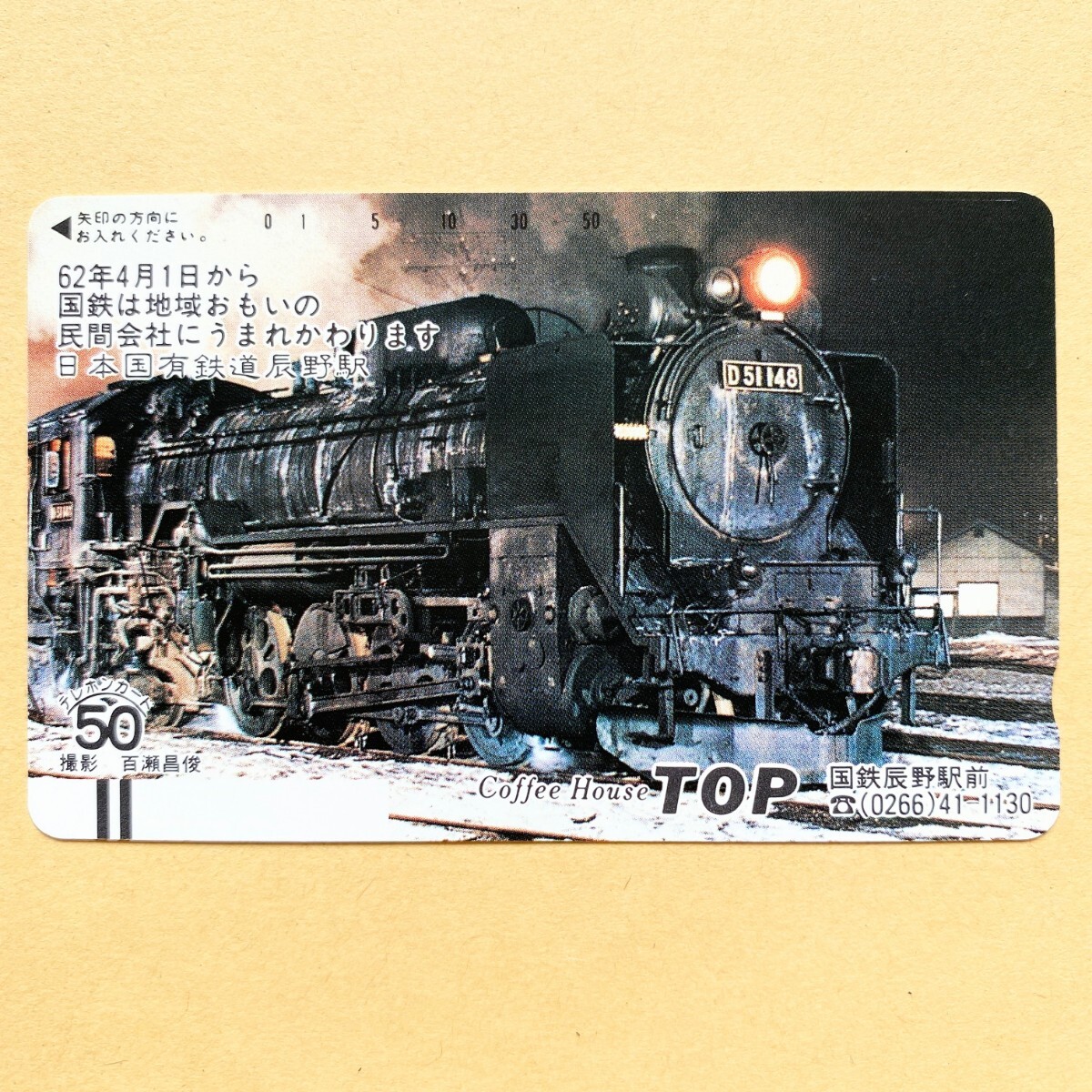 【未使用】鉄道テレカ 50度 日本国有鉄道 辰野駅 D51148 SL CoffeeHouse TOP