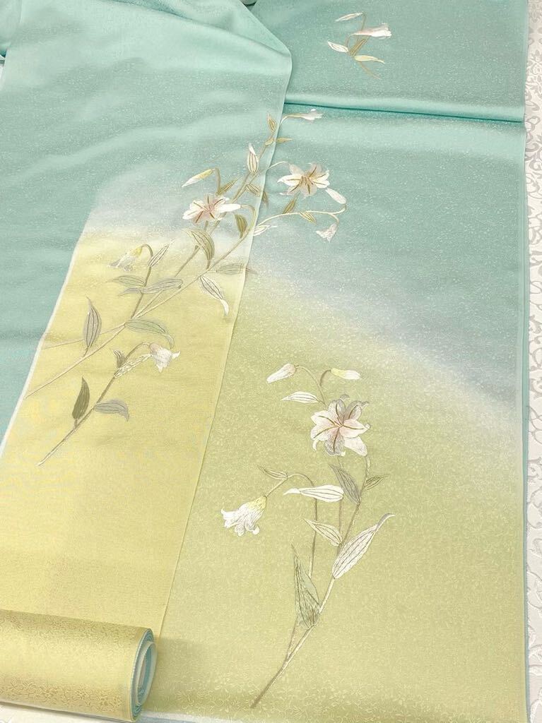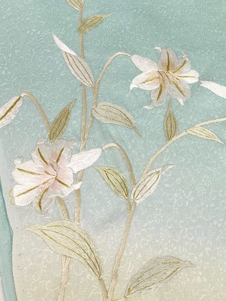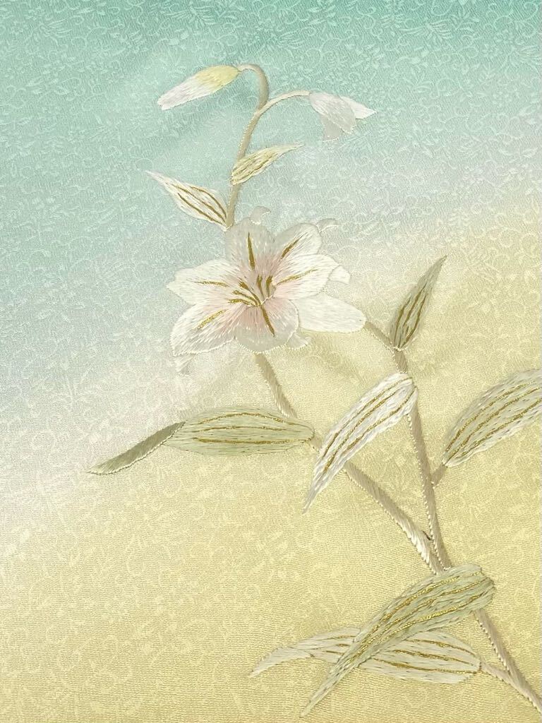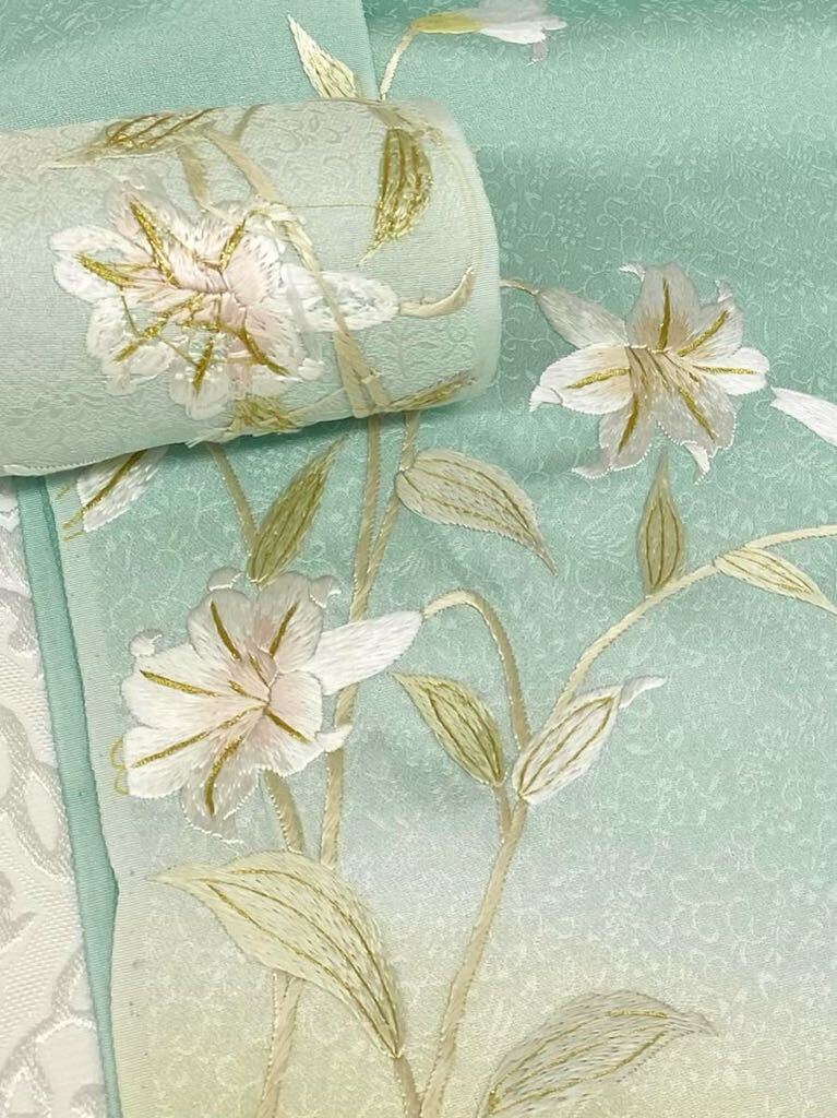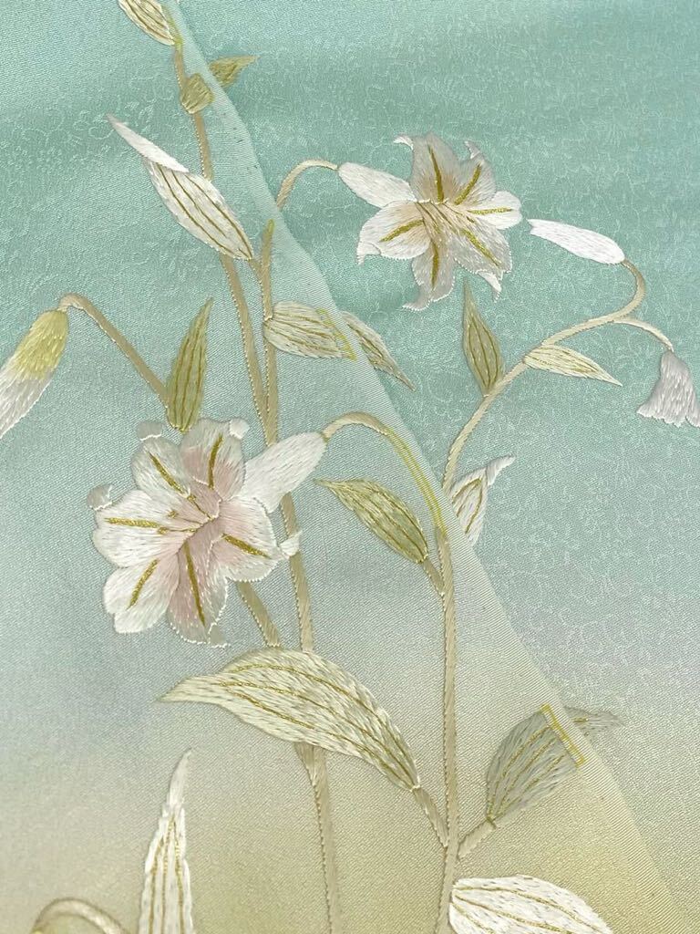 手刺繍 百合 訪問着 付け下げ 反物 紋意匠 金糸 正絹 アイスグリーン系