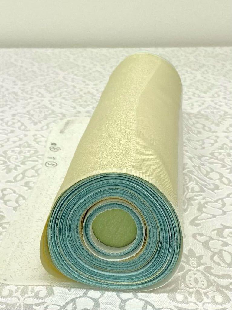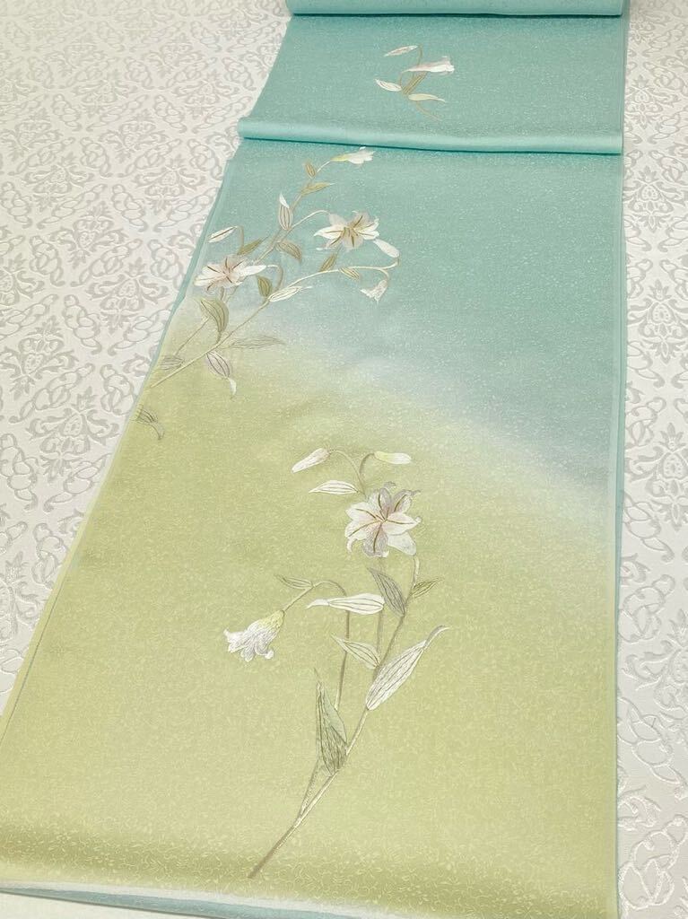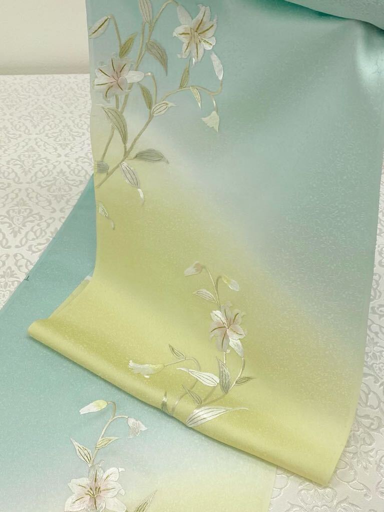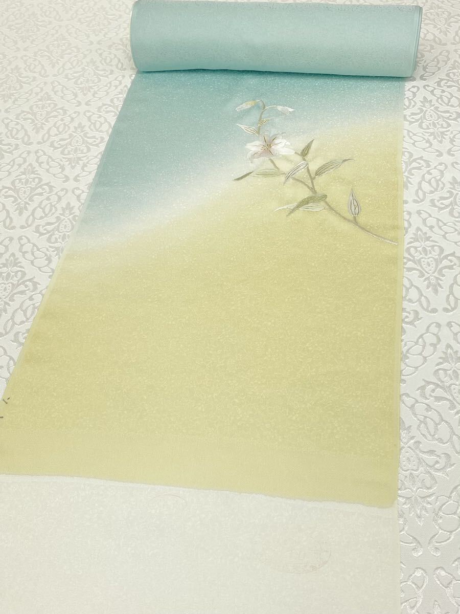 手刺繍 百合 訪問着 付け下げ 反物 紋意匠 金糸 正絹 アイスグリーン系