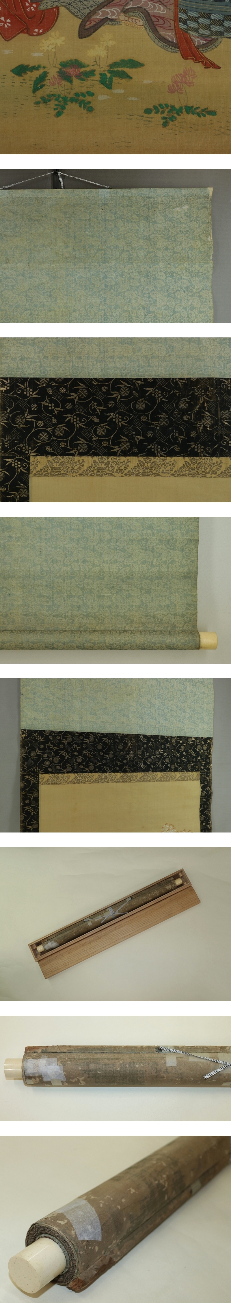 宮川長春 みやがわ-ちょうしゅん(1682-1752) 江戸時代中期の浮世絵師。天和2年生まれ。宮川派の祖。 肉筆の美人画で名高い。寛延2年日光廟修理で狩野春賀に雇われ, 画料の未払いから翌年一門による春賀ら殺傷事件が起こった。 宝暦2年11月13日死去。71歳。尾張(愛知県)出身 本紙は、染み、汚れ、軽い折れ、皺、ヤケ、剥落があります。 表装は、染み、汚れ、折れ、皺、虫食い、破れ、ほつれ、修理痕、ヤケ、 軸先に汚れがあります。 【サイズ】 作品 横約51cm×縦約116cm 表装 横約60.5cm×縦約197cm |