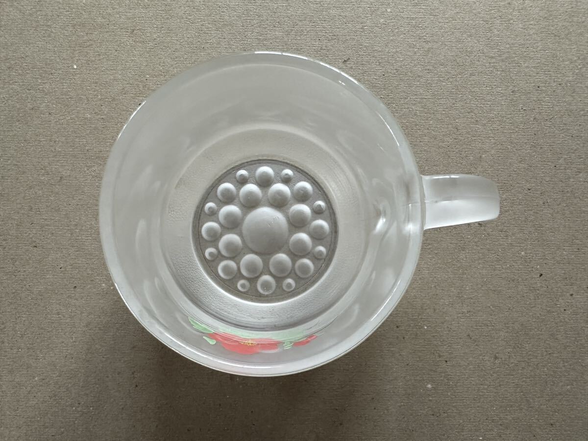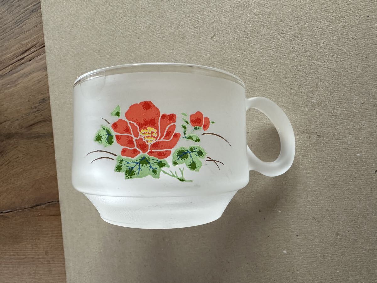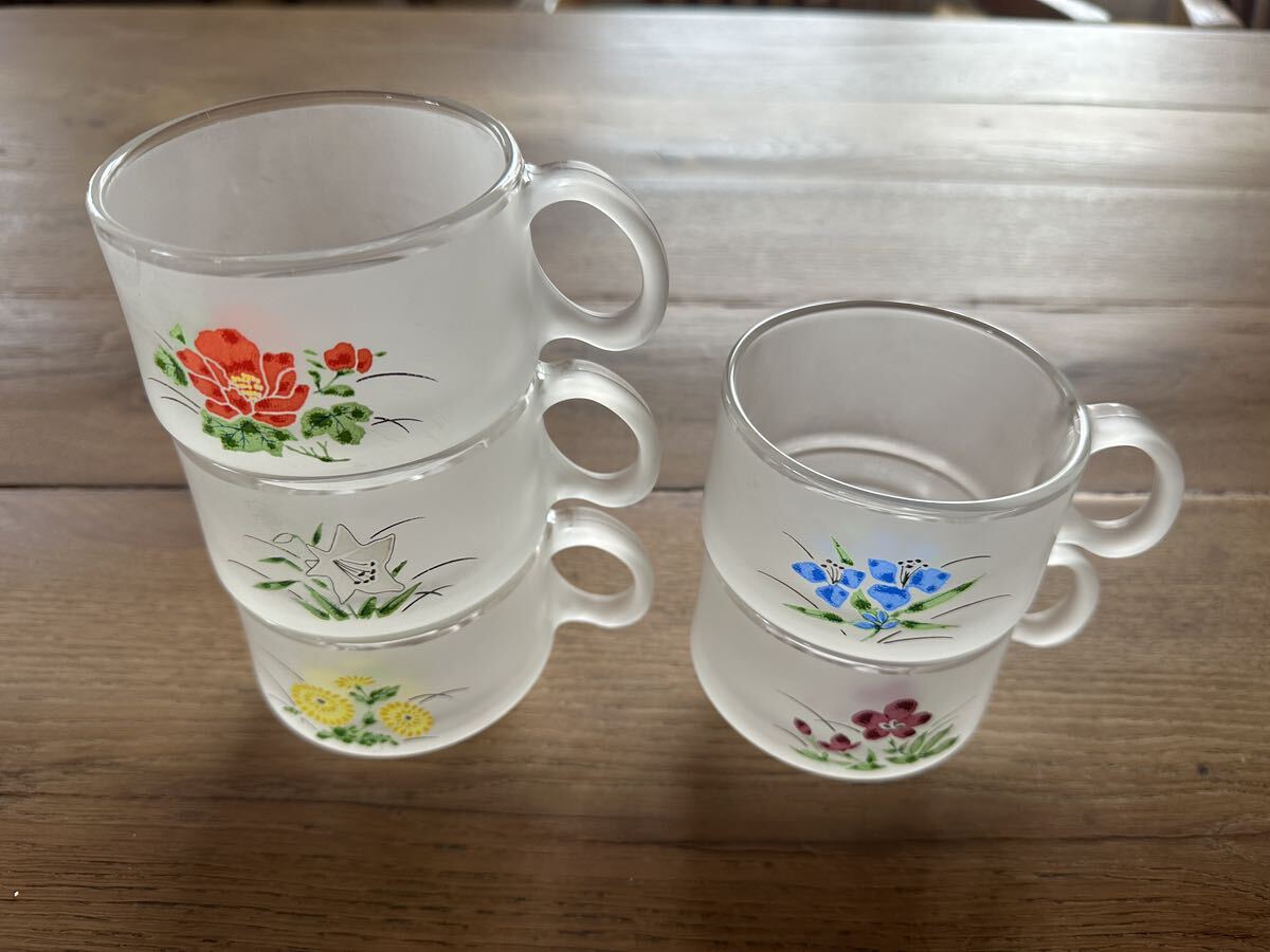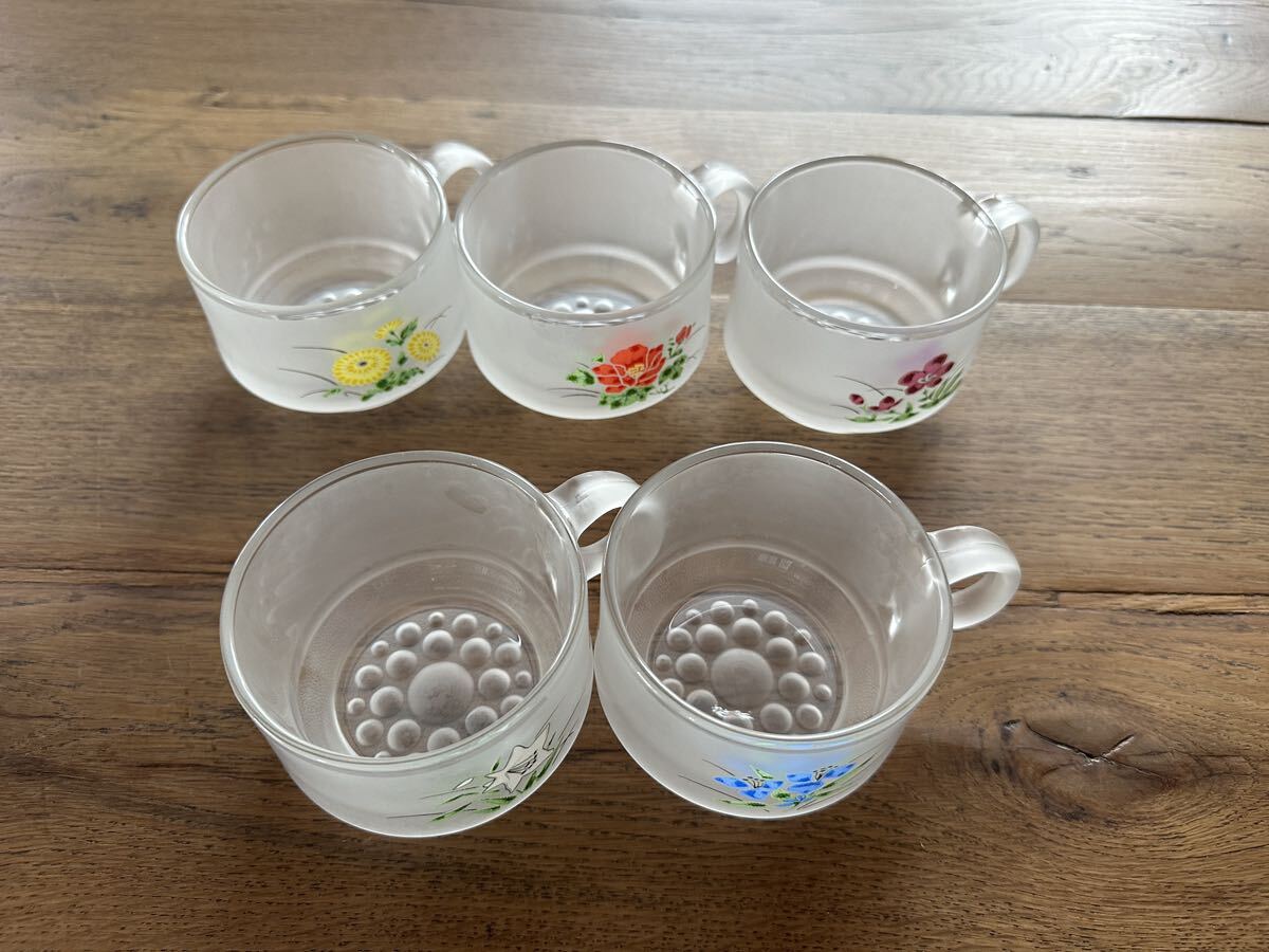 送料込み 古い 中古品 ガラス製 カップ 花柄 5種類 セット メーカー不明 、 レトロ 昭和 すりガラス コップ ティー 紅茶 コーヒー