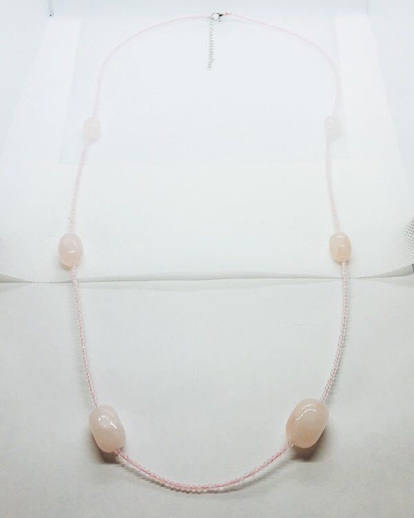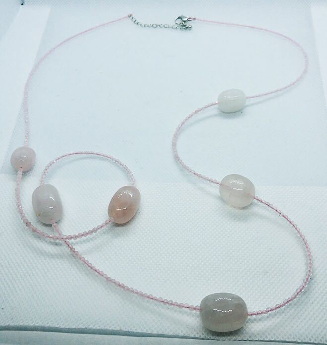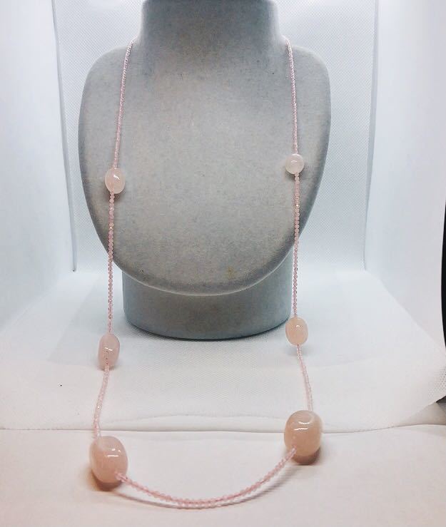 2ミリのミラーカットさせたローズクォーツ、間に8センチ置きに6珠の大きめなローズクォーツを等間隔に配置した、ステーションネックレスです。全長は80センチに5センチのフリーアジャスター付き、1連や2連のネックレスとしてお使いいただけます。