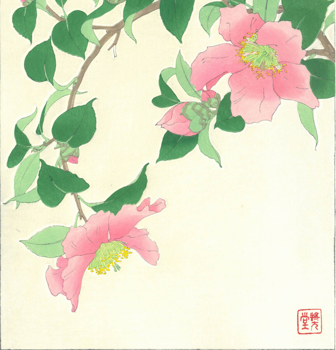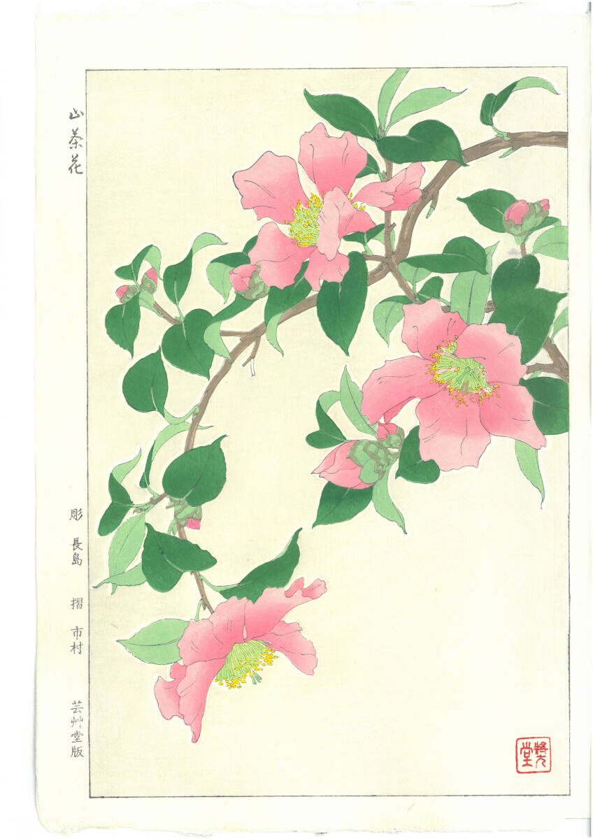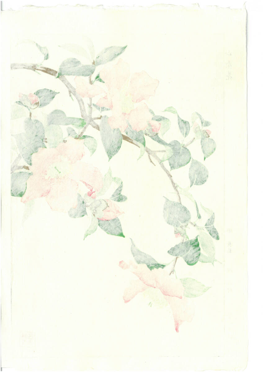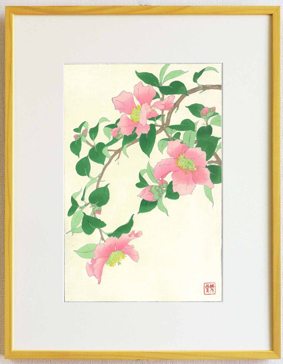 真作保証 額装  河原崎奨堂 木版画   #53 山茶花  Camellia  初版 昭和中期頃   自宅に届いて直ぐに飾れる京都の名品 花版画!!