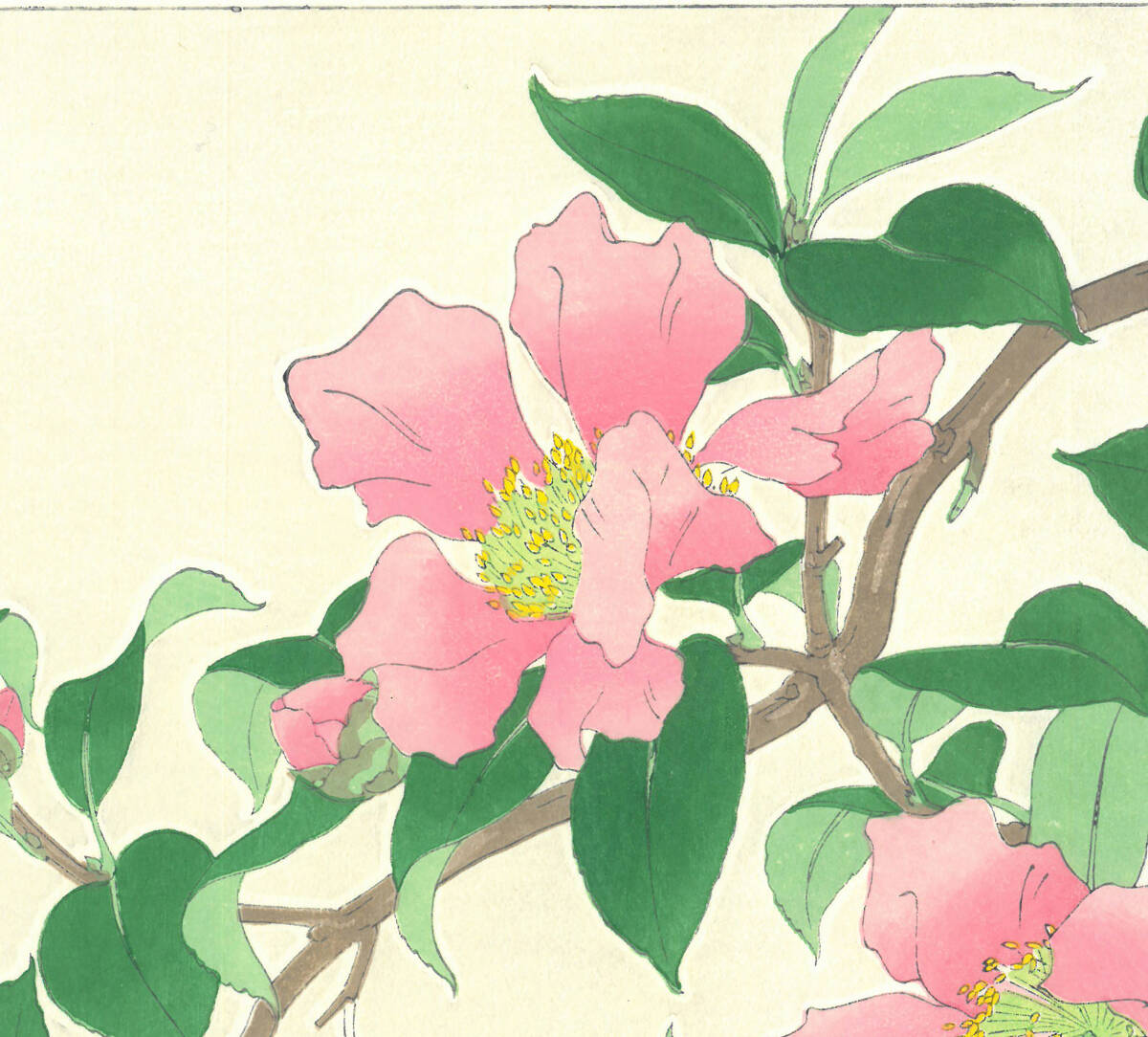 真作保証 額装  河原崎奨堂 木版画   #53 山茶花  Camellia  初版 昭和中期頃    自宅に届いて直ぐに飾れる京都の名品 花版画!!