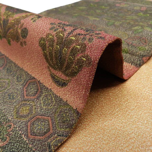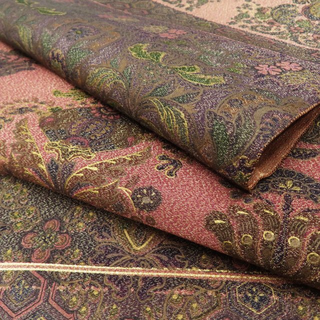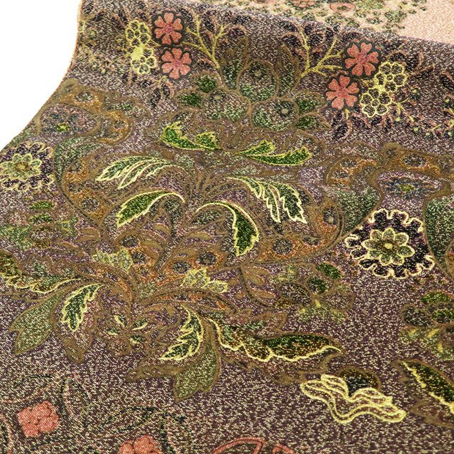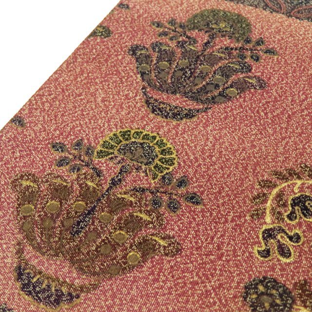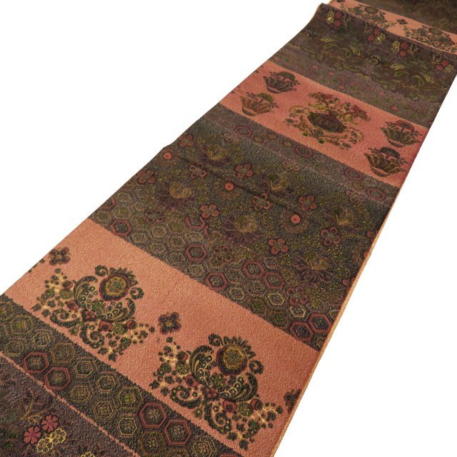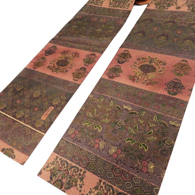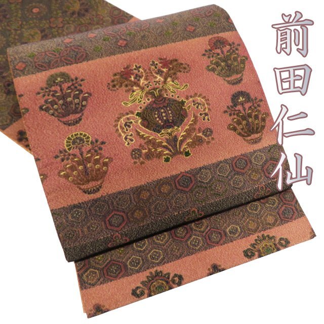 サイズ 446cm x 31cm 素材 正絹 商品ランク A ●お色 茶系色 金 金通し 更紗や繊細な唐花の文様等、シルクロードやヨーロッパ、南米を起源としたデザインを得意とする京都の名作家、前田仁仙。 その生み出す世界観は 色・柄・質ともに特徴があります。全て草木などの天然染料を使い、染め方は型紙を変える毎に丸刷毛で一つ一つ手で送り染めする高度な技術を要する摺り染がよく用いられます。 是非お手元にてご堪能いただきたい逸品です。 未使用の美しいお品物です。 一部商品は実店舗・他サイトでも並行して販売しておりますので売り切れの際はご了承ください。 その他多数販売中 oki | ||||||