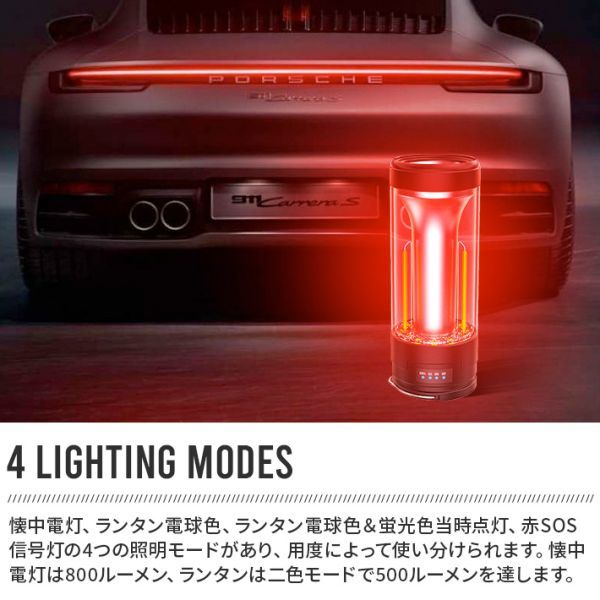 懐中電灯、ランタン電球色、ランタン電球色&蛍光色当時点灯、赤SOS信号灯の4つの照明モードがありますので用度によって使い分けられます。懐中電灯は800ルーメン、ランタンは二色モードで500ルーメンを達します。