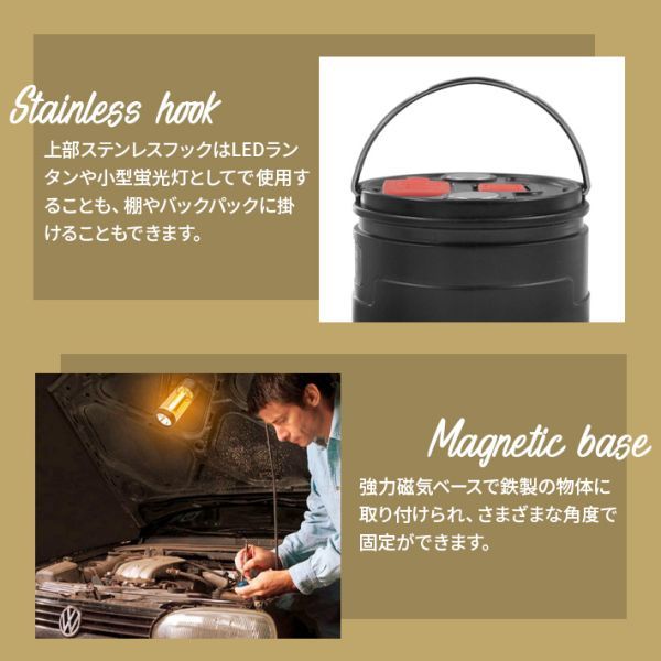 上部ステンレスフック:LEDランタンや小型蛍光灯としてで使用することも、棚やバックパックに掛けることもできます強力磁気ベース:鉄製の物体に取り付けられ、さまざまな角度で固定できます