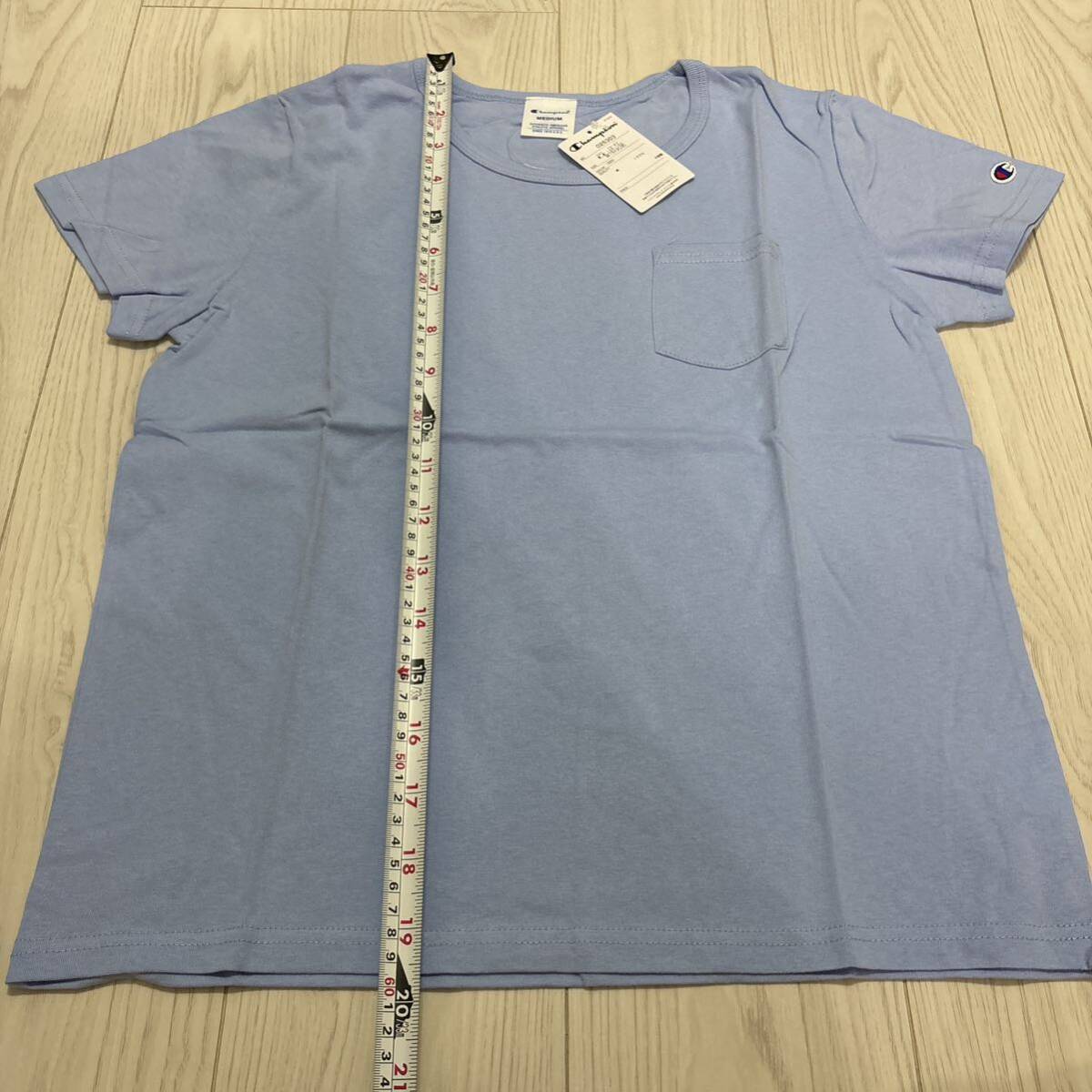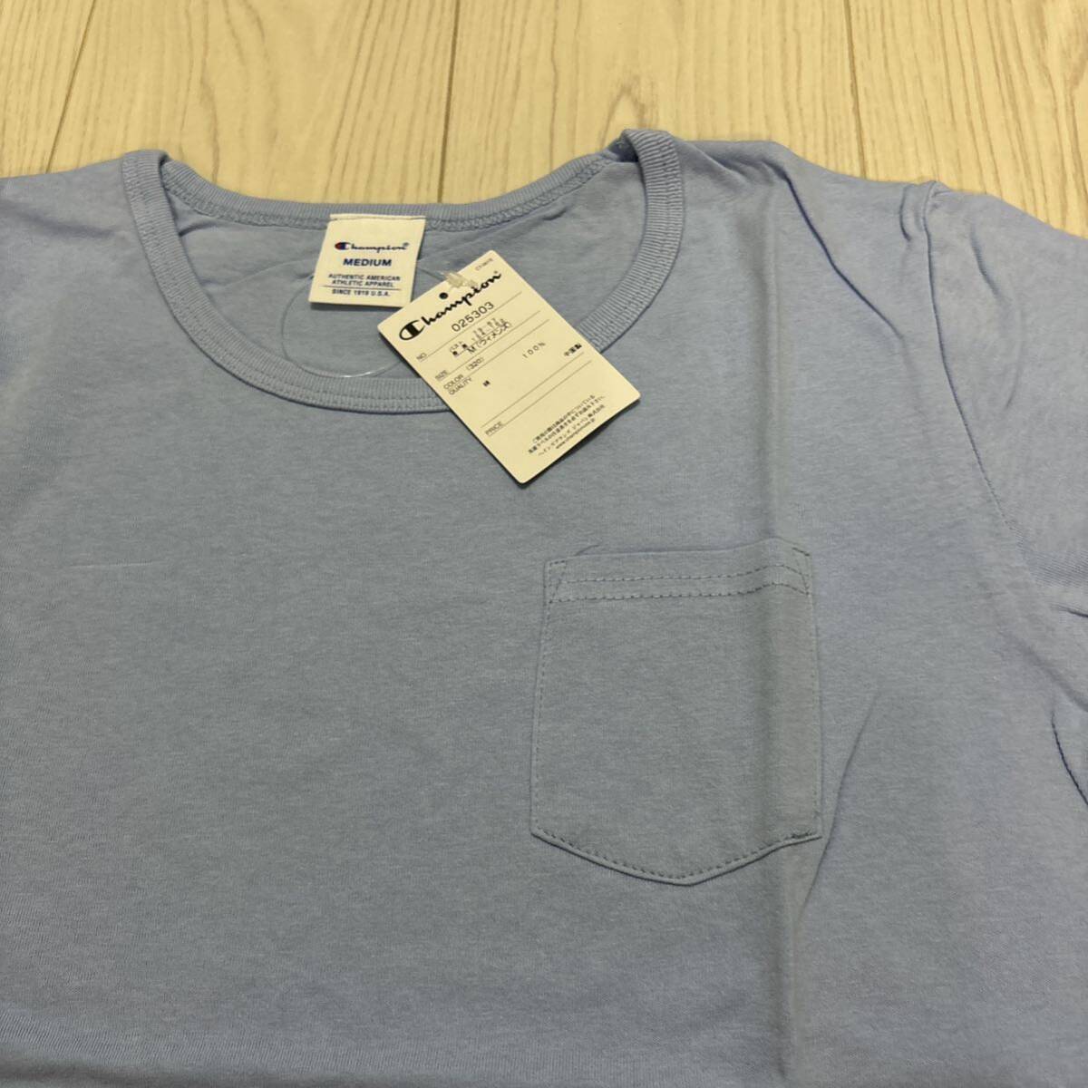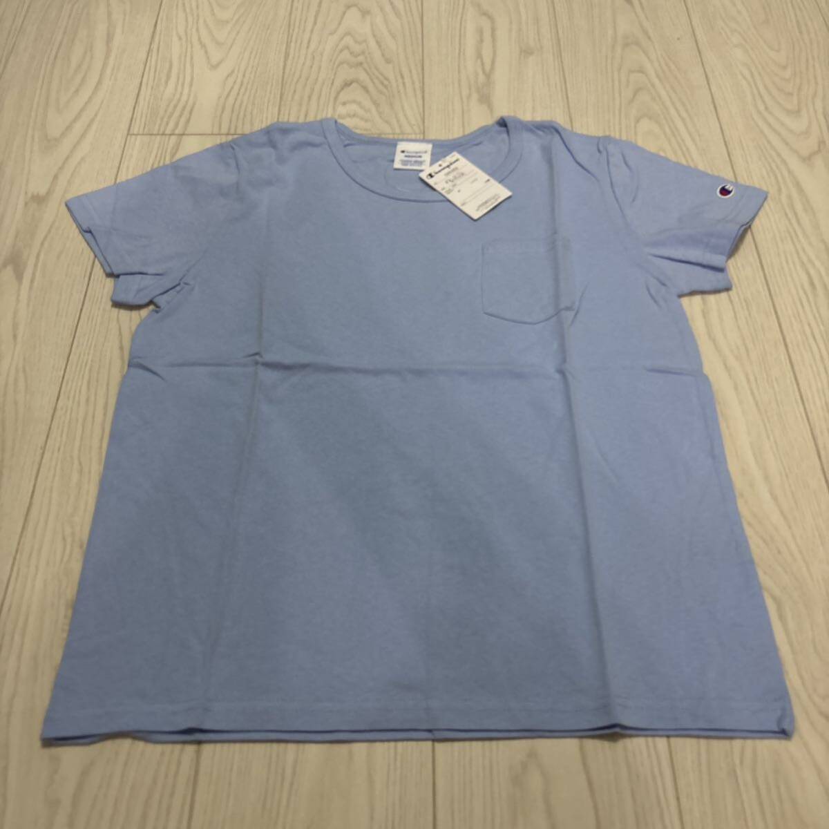 未使用●Mサイズ Champion チャンピオン ポケット Tシャツ/サックス/半袖/トップス/ウィメンズ/レディース/ブランド/ロゴ/綿100%★1276-4