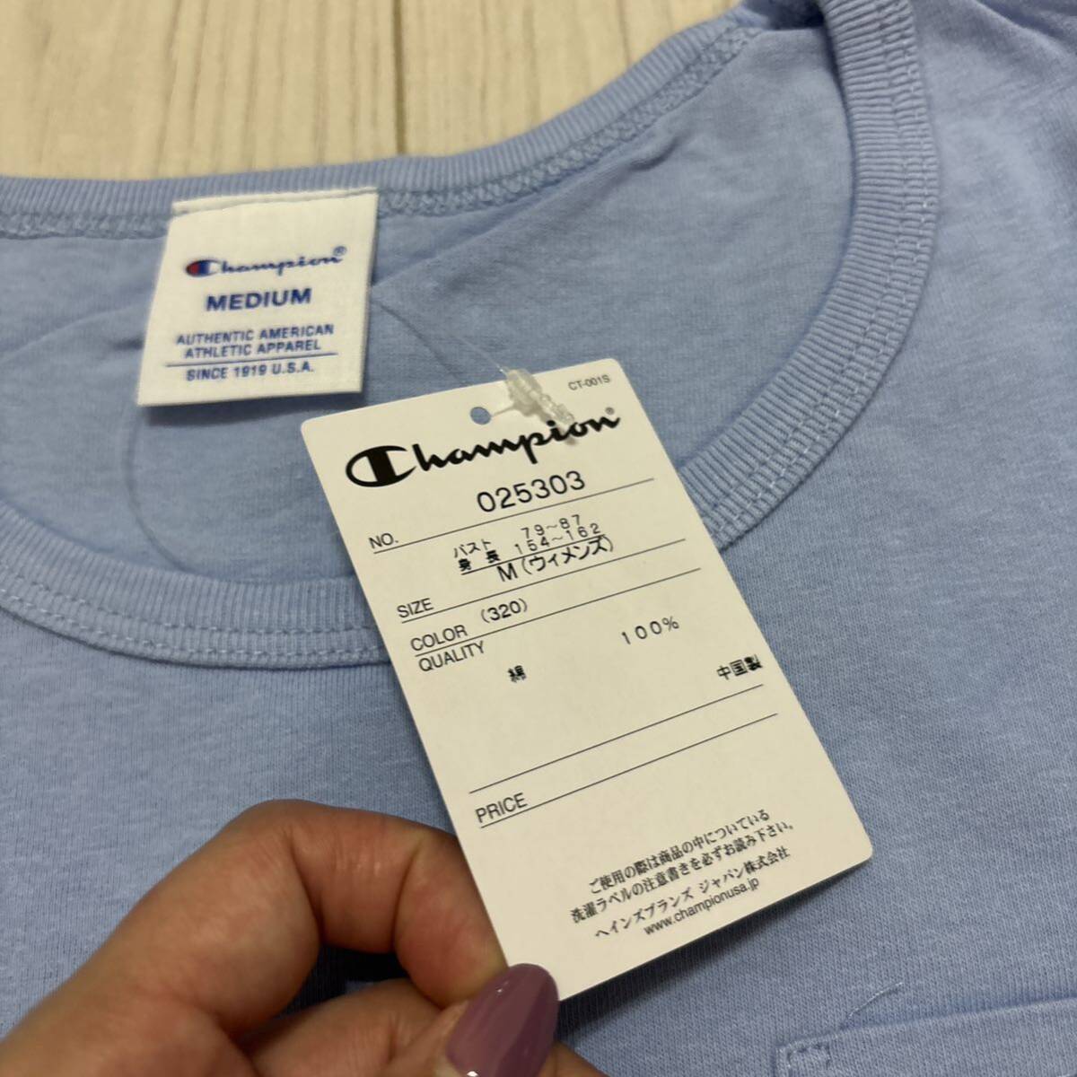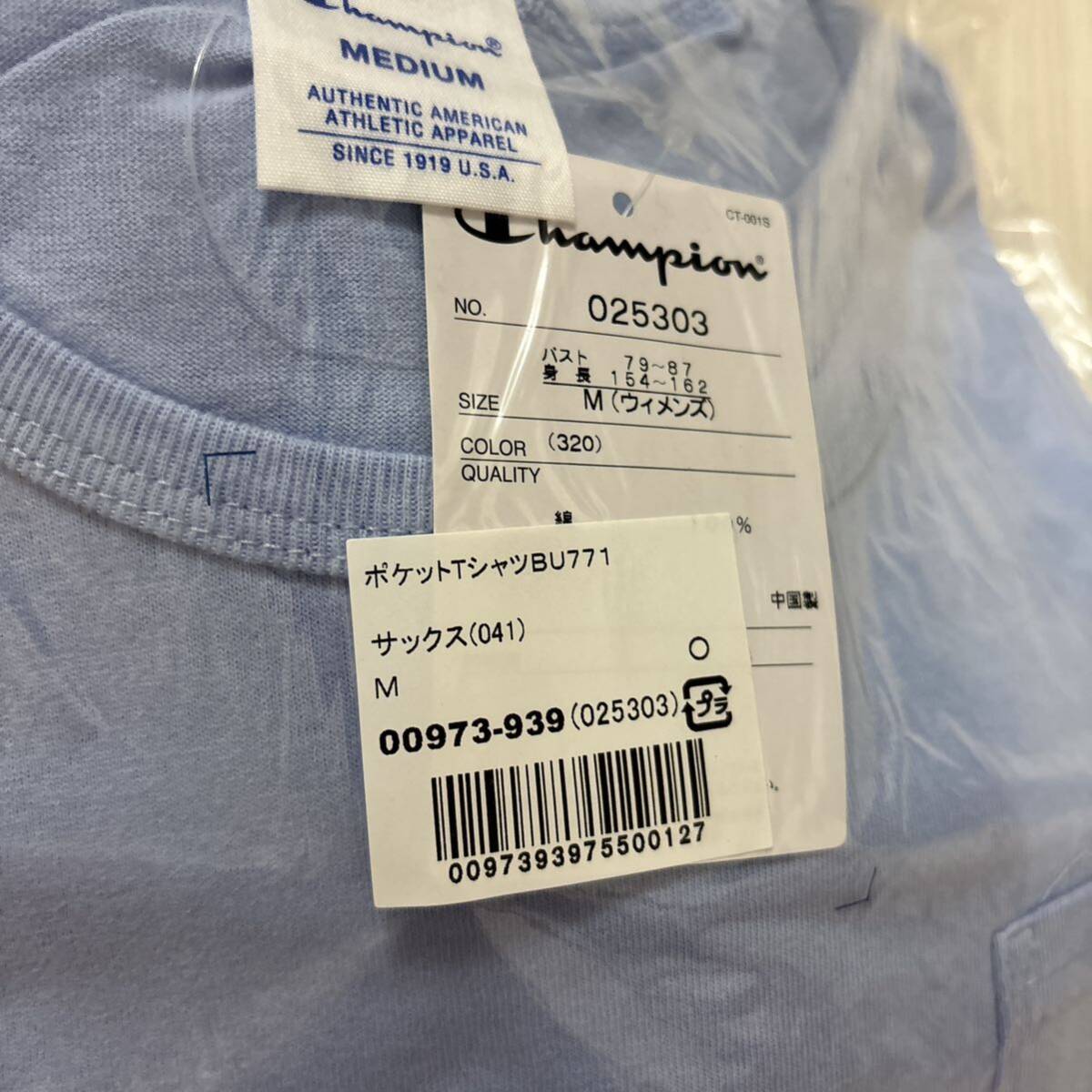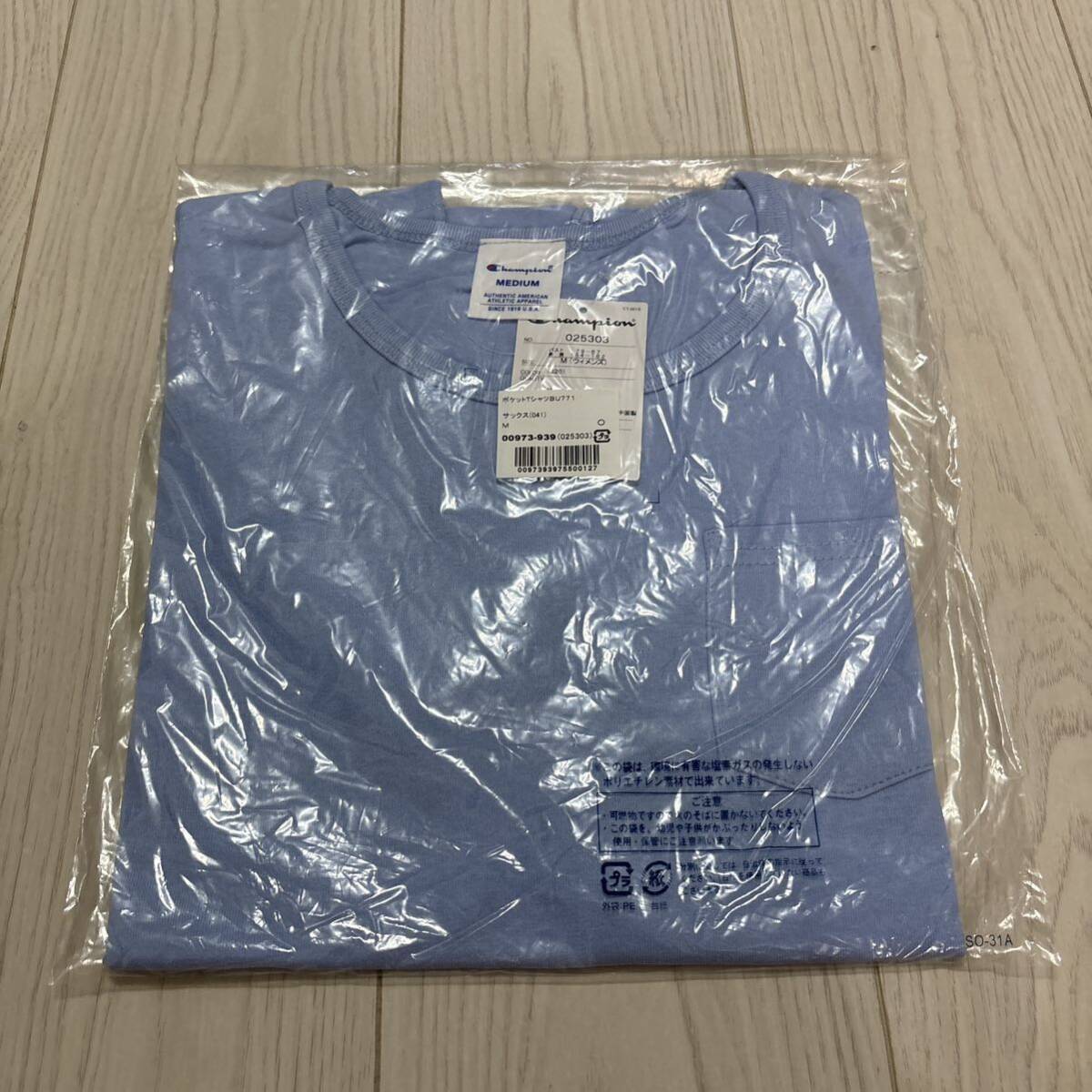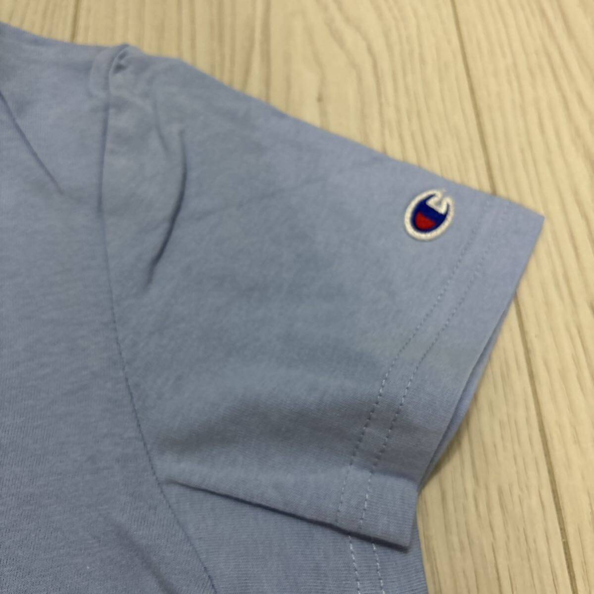 未使用●Mサイズ Champion チャンピオン ポケット Tシャツ/サックス/半袖/トップス/ウィメンズ/レディース/ブランド/ロゴ/綿100%★1276-4