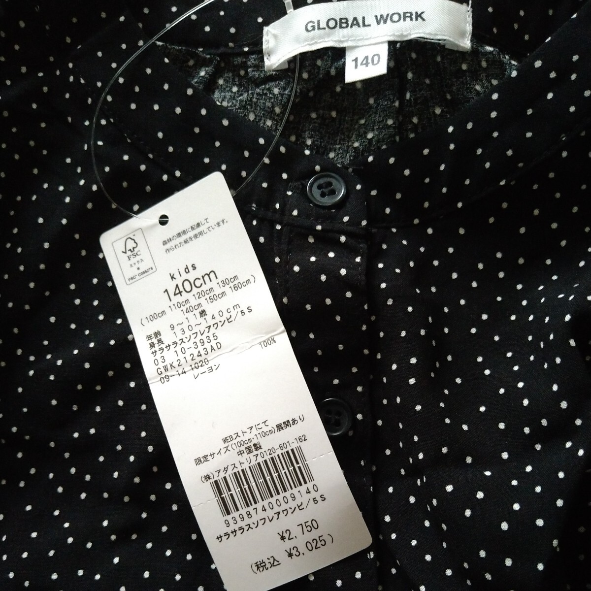 グローバルワークのサラサラスソフレアワンピース140cmです。ブラックにホワイトのドット柄が可愛いです。生地はさらっとしていて着やすそうです。
