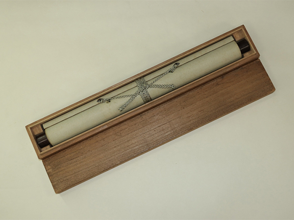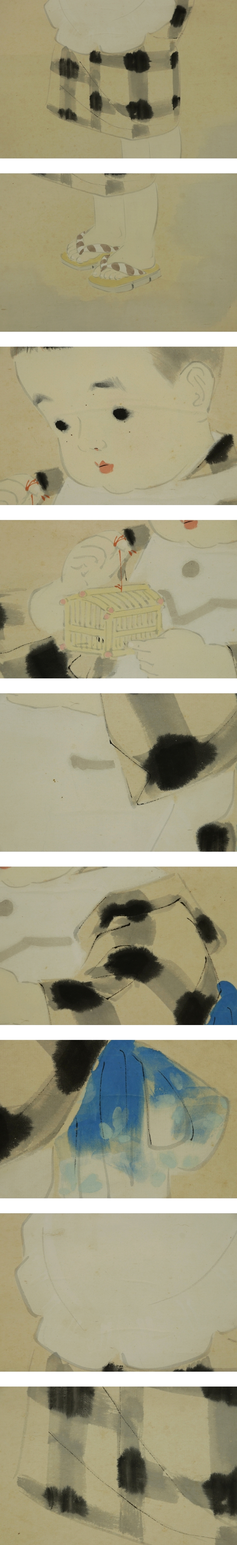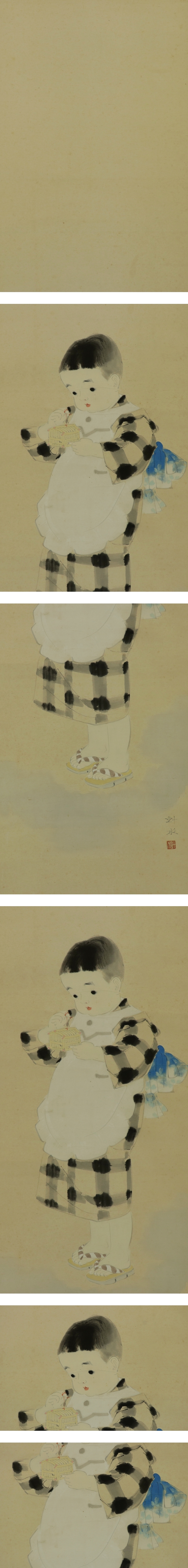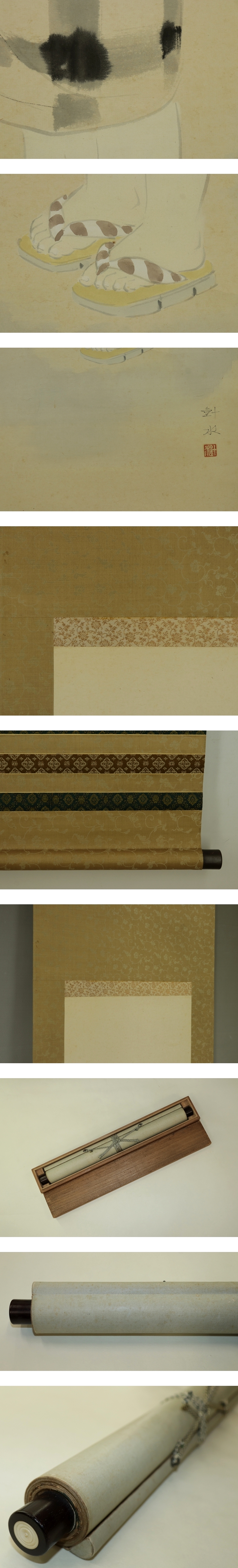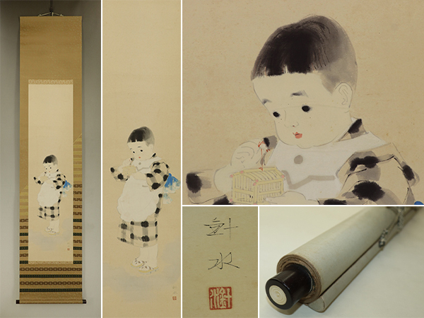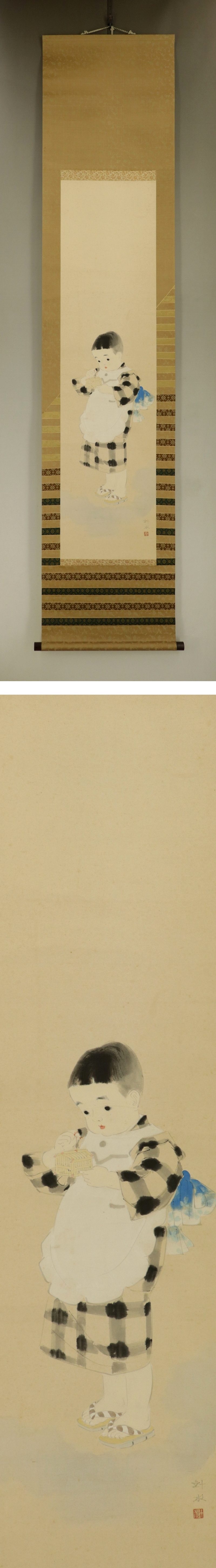 田中針水 たなか-しんすい(1902-1979) 小樽出身の日本画家。川合玉堂に師事。 玉堂は狩野派の作風に写生を取り入れた穏やかな風景画で知られ、 弟子たちのほとんどが風景を描いていたが、針水は、弟子入りしてすぐに足を事故で失ったため、 写生に同行することが出来ず、やむなく人物を描いていたという。 戦前から、帝展に出品すれば必ず入選するという躍進ぶりで、戦後も引き続き日展で活躍した。 戦後の作品は、日本画の伝統である線を抑えた洋画的な表現になった。 本紙は、染み、折れ、皺、浮きがあります。 表装は、染み、汚れ、軽い皺、虫食い、ほつれがあります。 【サイズ】 作品 横約33cm×縦約129cm 表装 横約45.5cm×縦約210cm |