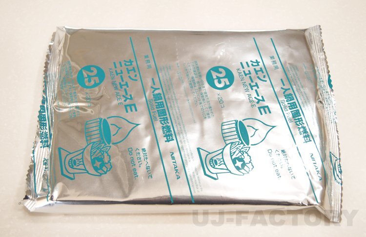 | 【 ここがポイント 】 ★多くのホテルや旅館で色々な料理に使用され、固形燃料の国内シェアナンバーワン! ★家族で好みの一人鍋が人気上昇中!また、アウトドアでの簡単調理に大活躍♪ ★カエン・ニューエースEの特徴 ①1個ずつ親切表示:すべてに製品サイズ(グラム数)と「食べられません」を表示しています。 ②手間いらず:アルミ箔のカップでそのままコンロに!廃棄も簡単です。 ③確実に着火:ロングライターの火で、直ぐに着火します。 ④すばやく加熱:初期火力が強いので、料理をどんどん加熱。 ⑤燃焼状態が安定:料理の出来上がりにバラつきがありません。 ⑥臭いが少ない:消臭剤配合で、消化時の臭いを低減(一部商品除く) ※製品は10g・15g・20g・25g・30g・35g・40gで、用途に合わせて最適なサイズをご利用ください。