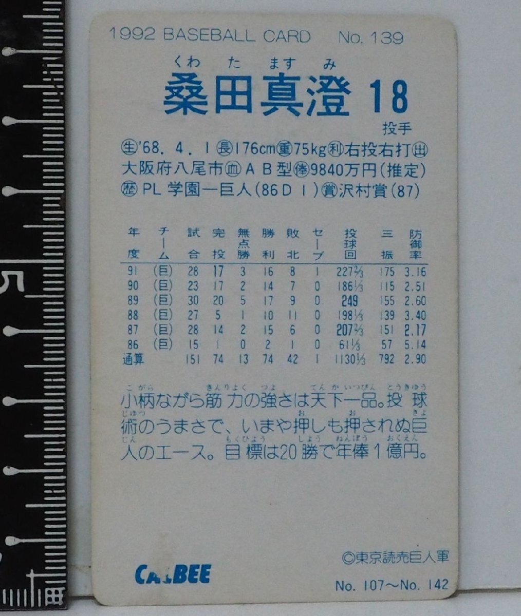 92年 カルビー プロ野球カード No.139【桑田 真澄 投手 読売ジャイアンツ巨人】平成4年 1992年 当時物 Calbeeおまけ食玩BASEBALL【中古】