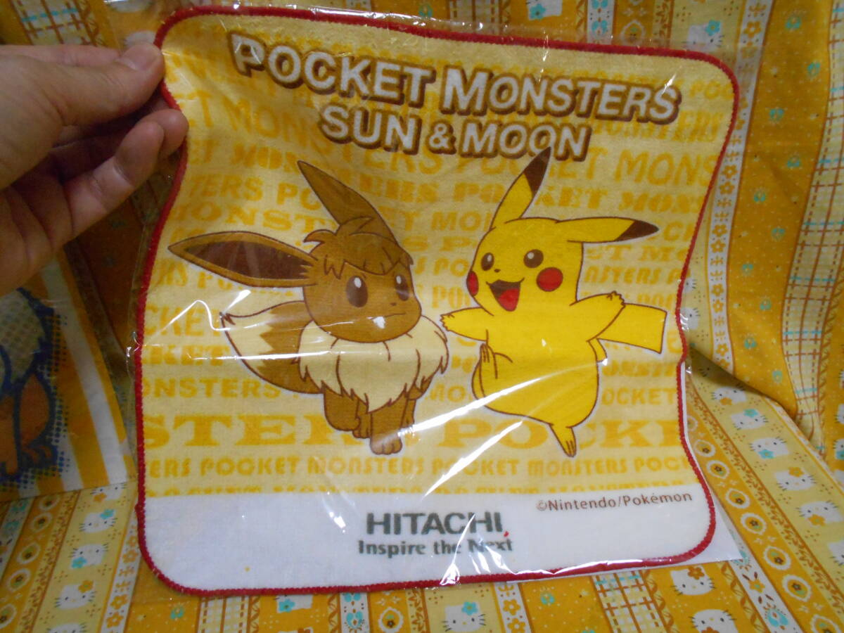 クリアファイル2種は裏側がイーブイだらけのものと色々な場面が描かれた2種です。A6版のクリアファイルはノベルティのお品です。ハンドタオルは一辺25cm、日立の非売品のお品です。イーブイや色々なポケモンが可愛く描かれた4点セットのお品です。
