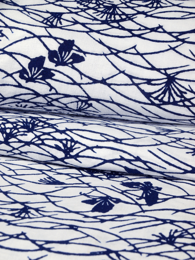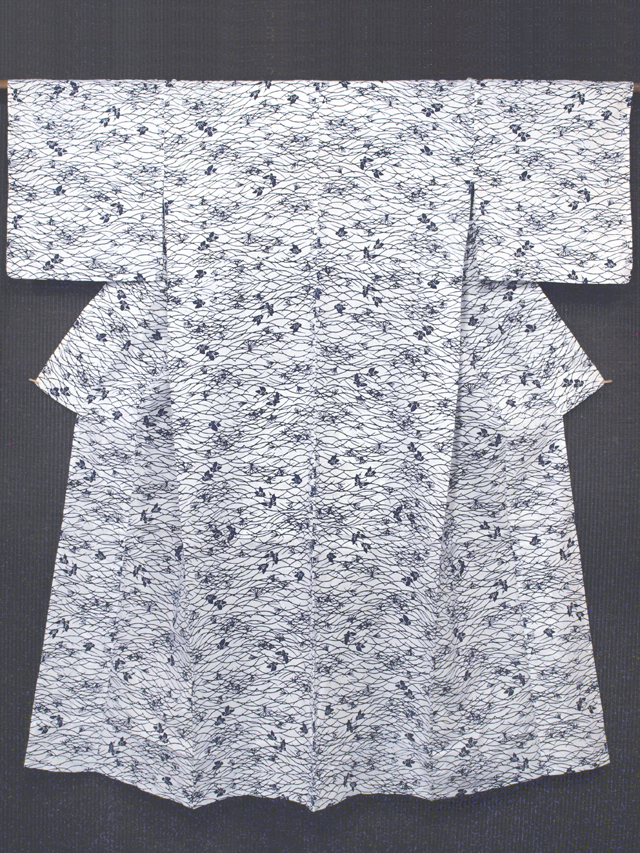 白色の地に、濃藍(こいあい)色で草花と揚羽蝶の文様が染められている、本染の綿の浴衣です。単衣仕立てで、居敷あてが付いています。 アンティークに近いお品で、渋みとかわいらしさが同居しためずらしさのある意匠です。本染は、下絵-型作り−糊置き−はけ染め−乾燥−水洗い−乾燥といった工程を手作業で繊細かつ本格的に行う伝統的な技法です。表裏両面に柄が染まっているのが特長で、現代のものに多く見られるプリントでは困難です。 ユーズド品で、衿山がごくうっすらと黄変気味なほか、 衿山の側にこまかな黄変がちらほらと若干あります。また、両袖口へりがごくうっすらと黄変気味ですが、あまり判別はつきません。いずれのダメージも漂白剤などでお洗濯いただければきれいになりそうで、そのほかに目につく大きなしみやよごれ、褪色などのダメージはありませんが、状態ランク=「D」のご着用対象外、リメイク素材用とさせていただきます。 |