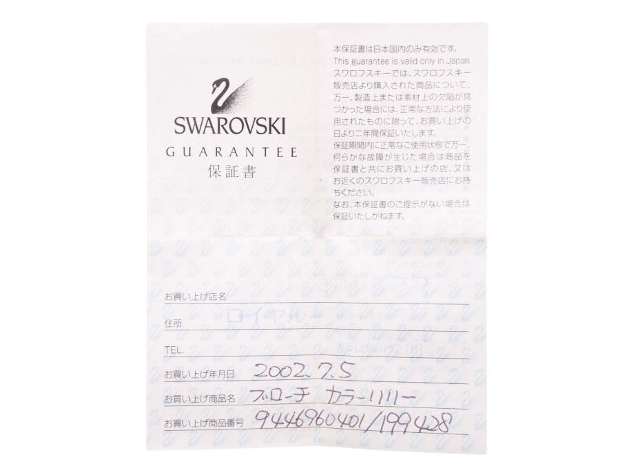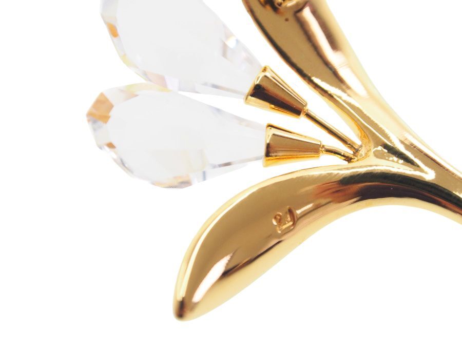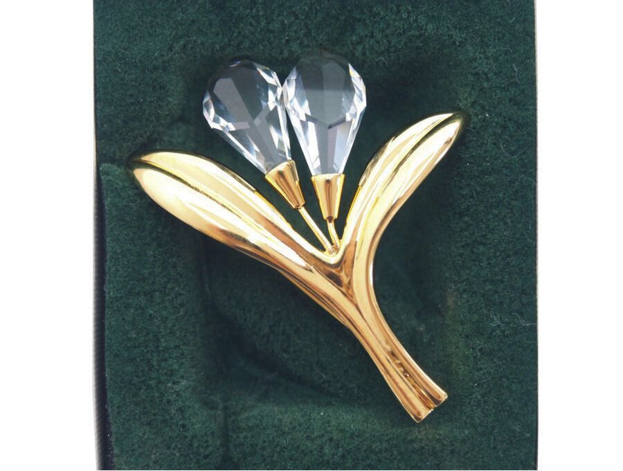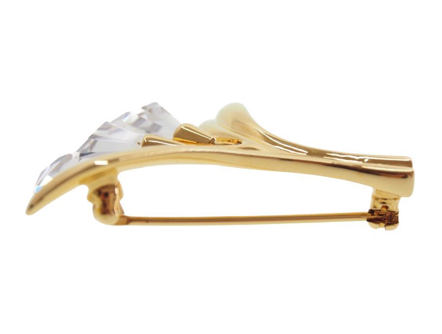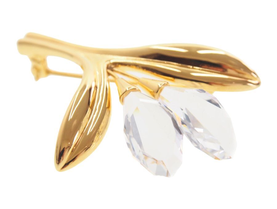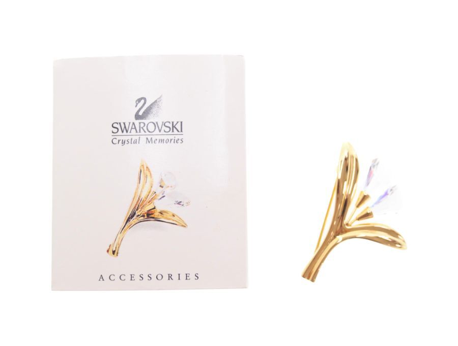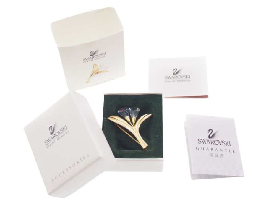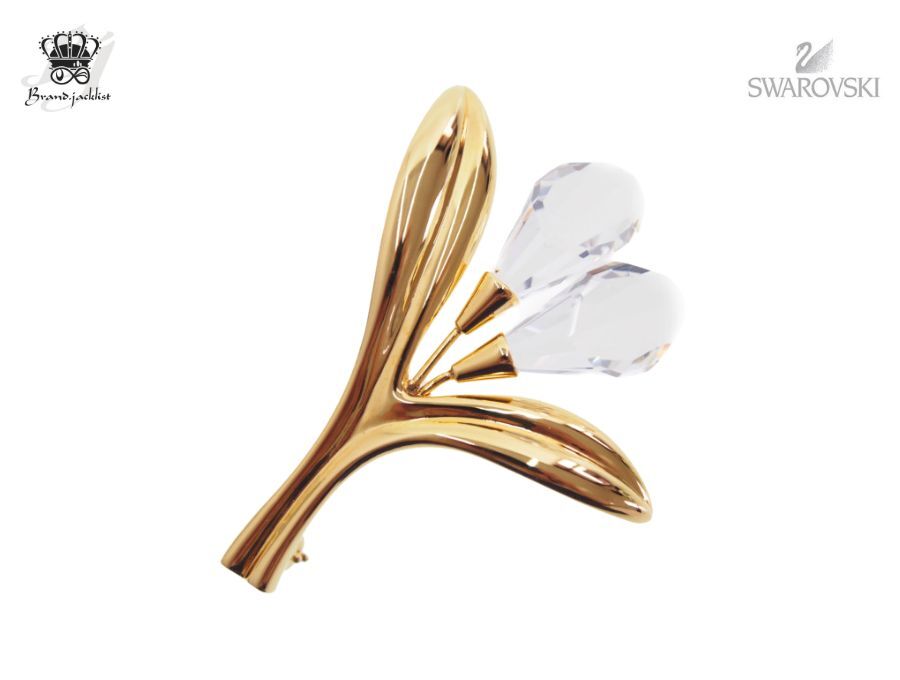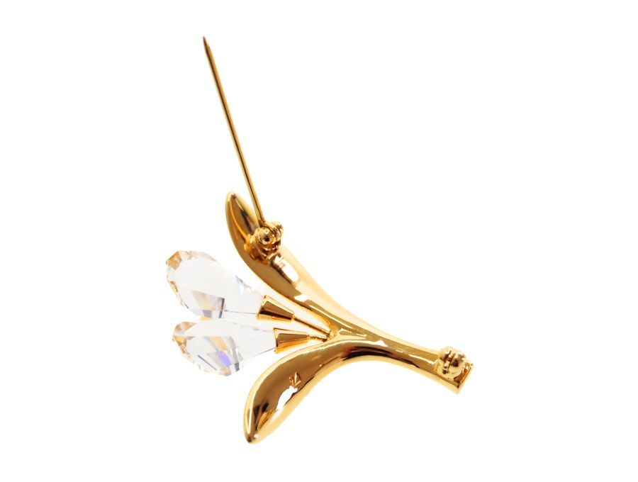 スワロフスキーのブローチです。カラーリリー(百合の花)がモチーフになっており、花びらが透明クリスタルになっています。ゴールドカラーの茎にはスワンの刻印も入っております。カラーリリーの花言葉は「華麗なる美」「乙女のしとやかさ」「清浄」なので、こちらのアクセサリーで華麗に装ってください。小さくとも存在感のあるブローチは、装いのアクセントになりますよ。