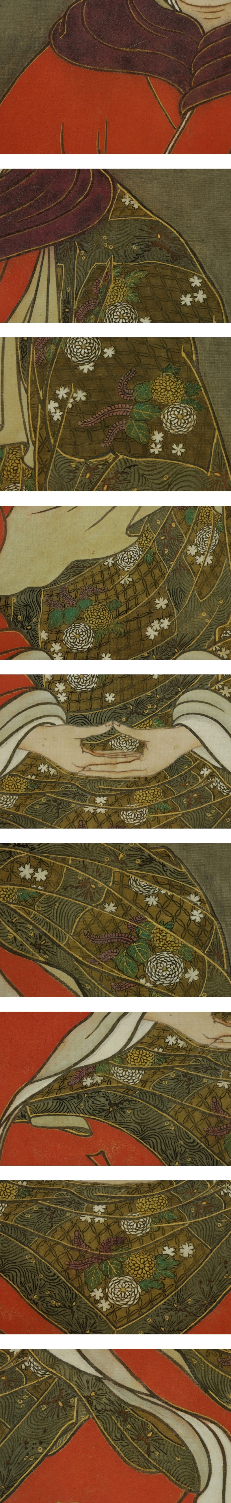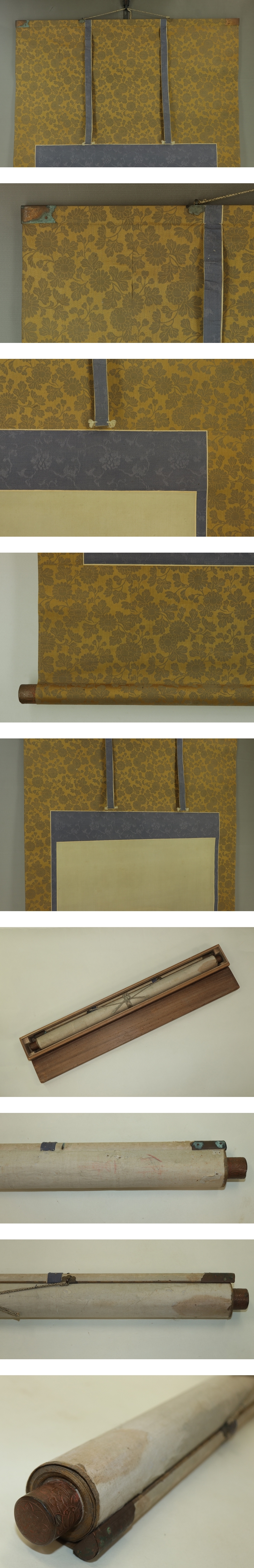 古仏画【伝教大師】 本紙は、染み、汚れ、軽い皺、ヤケがあります。 表装は、染み、汚れ、折れ、皺、虫食い、破れ、ほつれ、 金具部に錆や変色、軸先に変色があります。 【サイズ】 作品 横約50.5cm×縦約118cm 表装 横約66cm×縦約187cm |