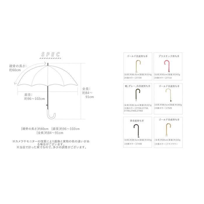 | 素材 | [傘生地の組成]ポリエステル100% [持ち手]合皮製、もしくはプラスチック製 ※傘生地の柄により、持ち手の素材が合皮製のものと、プラスチック製のものがあり、それぞれカラーが異なります。 |