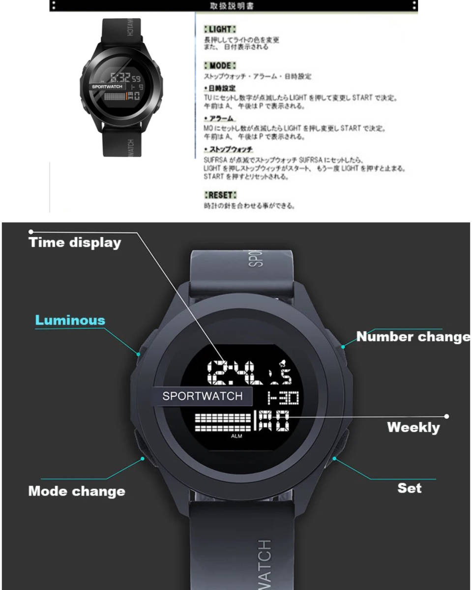 時間、曜日と日付のLEDディスプレイ ・アラームと時報 ・12/24Hフォーマットオプション ・ストップウォッチなど多機能ウォッチでございます。