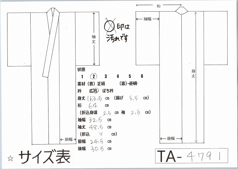 | 注意事項 | 全品、買取品です。 特に中古品は保管臭がある物もございます。 お含み置きくださいますようお願い申し上げます。 当方では、一切のクレーム、返品等は、 承れませんので、ご理解頂きましての ご入札をお願い致します。 完璧を求める方、気になる方は ご入札、ご遠慮頂けますよう 宜しくお願い致します。 中古品は全ての事をお伝えするのは 不可能ですので気なりましたら ご入札をお控え下さい。 入札の取り消しは致しませんので、 良く写真をご覧いただき、 説明文を読んでいただきますよう お願いいたします。 <商品を落札された方へ> ヤフーからの落札通知メールと共に送られる 【出品者からの連絡】をご覧ください。 そちらにお取引についてのご案内を差し上げております。 そちらをこちらからの最初のご連絡とさせていただいております。 落札者さまは、取引ナビよりお取引についての必要事項を オークション終了日より2~3日中にご連絡ください。 ※※お急ぎのかたはご連絡お早めにお願いいたします。※※ ------------------------------ <落札商品のお取り置きについて> かんたん決済期日内でお願い致します。 ------------------------------ <その他> 土・日曜、祝日にはご連絡や商品の発送は行っておりませんので ご了承ください。 メールなどのご連絡は、午前10時~午後4時まで対応しております。 夜間、早朝には対応できませんのでご了承ください。 オークション終了日より2~3日中にはご連絡を頂ける方のご入札を お願いいたします。 発送詳細<発送時の梱包について> エアパッキンなどでの簡易梱包とさせていただいております。 着物を小さく畳むなどして発送いたしますので多少のシワは ご了承ください。 | |