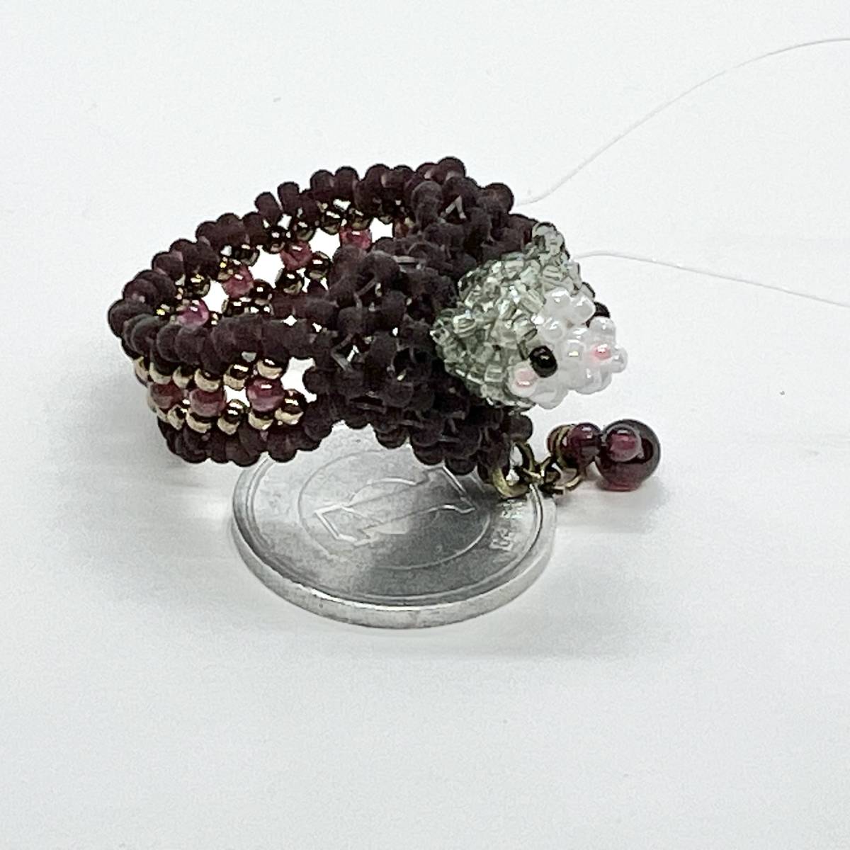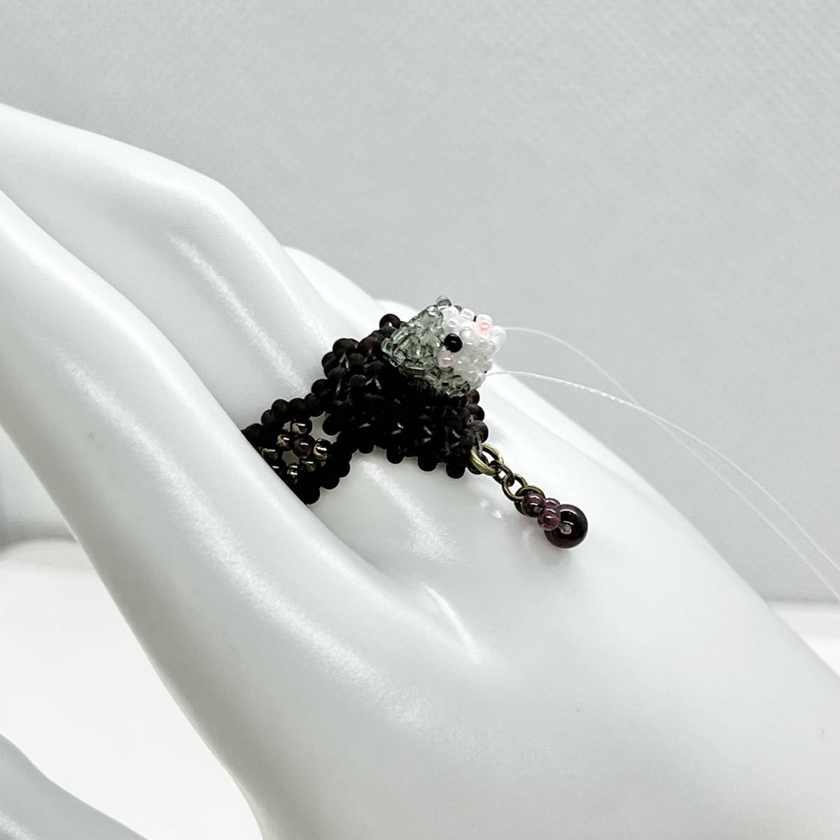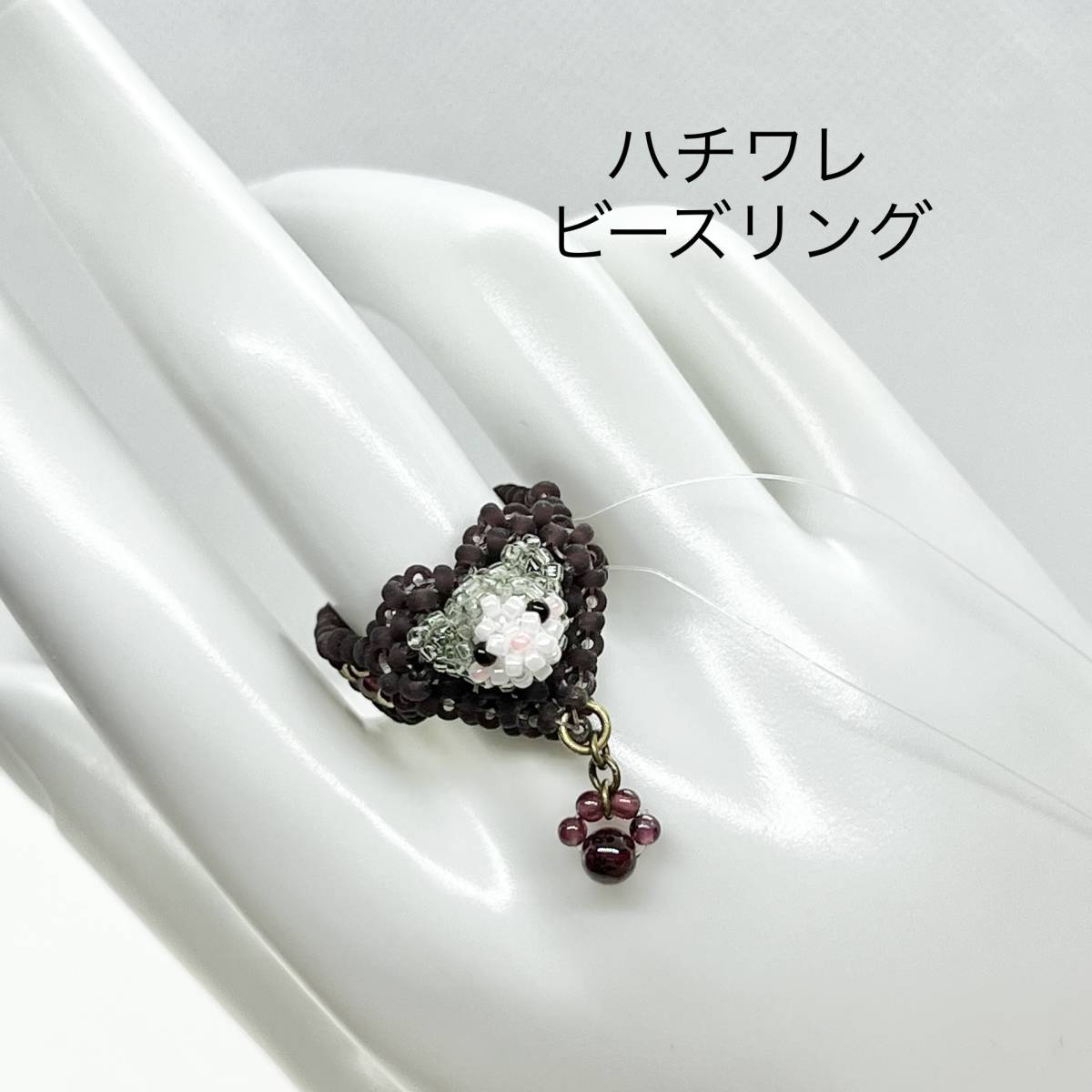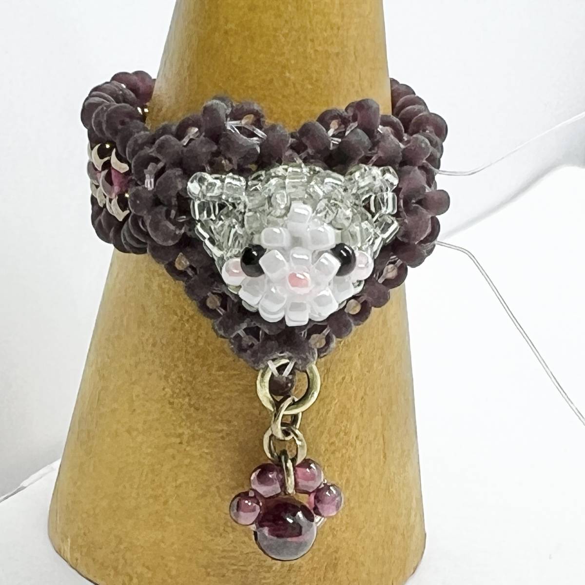 ビーズで編んだハチワレ猫ちゃんお顔のハートのリング