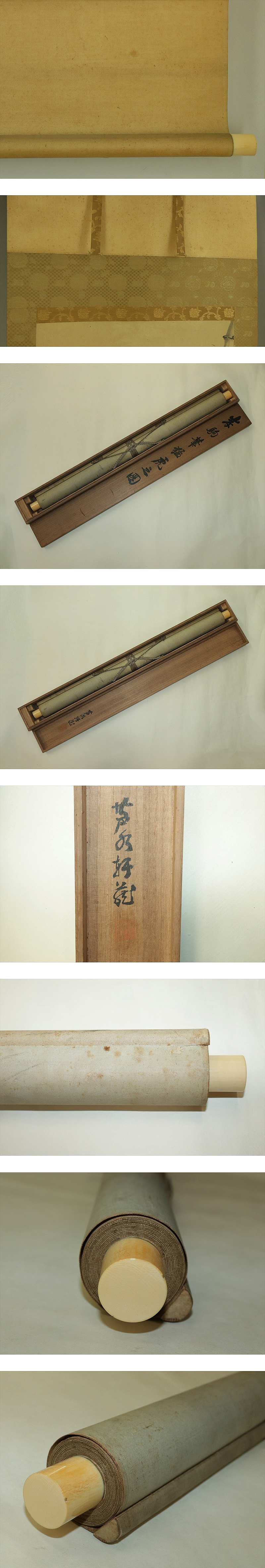 岸駒 がんく(1756-1839) 江戸時代中期-後期の画家。 宝暦6年生まれ。岸派の祖。はじめ狩野派を,のち沈南蘋や円山派などの画風をまなぶ。 鳥獣,とくに虎を得意とし,独自の画風を確立した。京都御所や金沢城の障壁画を制作。 天保9年12月5日死去。83歳。加賀(石川県)出身。 本姓は佐伯。名は駒,昌明。字は賁然。通称は雅楽助。号は華陽,蘭斎など。 本紙は、染み、汚れ、折れ、皺があります。 表装は、染み、汚れ、折れ、皺、くすみ、虫食い、ほつれがあります。 【サイズ】 作品 横約59cm×縦約125cm 表装 横約74cm×縦約218cm |
