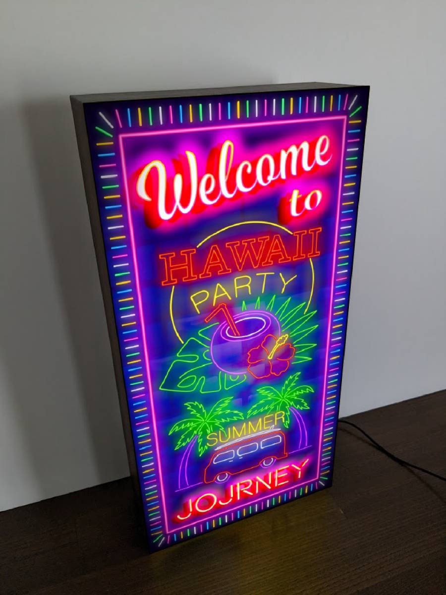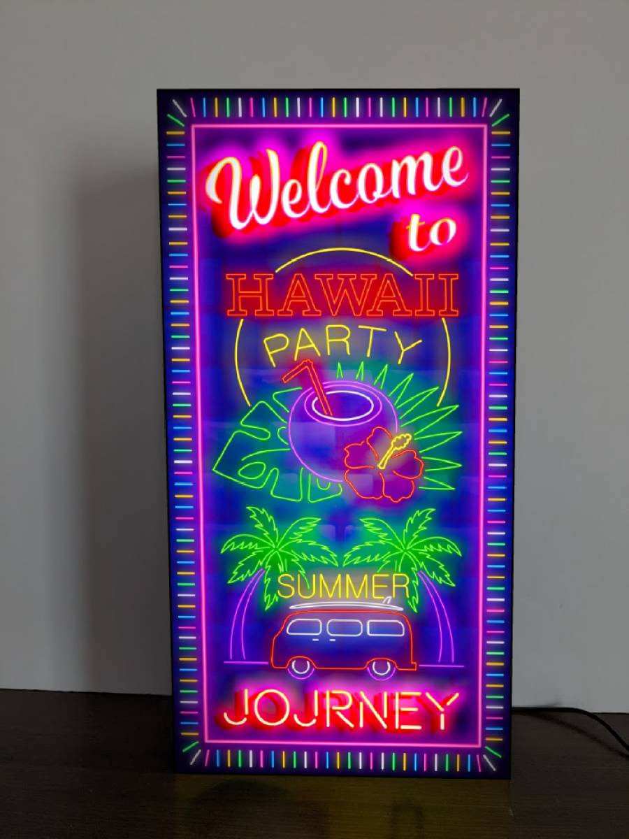 店舗、自宅、オフィスの窓際・カウンター・棚・テーブルやちょっとしたスペース、車内・キッチンカー・屋台・イベント・パーティーなどに 邪魔にならず丁度良い大きさの電飾看板Lサイズです★ 文字変更無料、プレゼントにも大変好評頂いております★ ◆サイズ◆40センチ×20センチ×奥行き7センチ ◆材質◆本体(アクリルプラスチック製)・表示面(IJバックライト発光フィルム貼り) ◆電源◆USB供給電源(家庭用コンセントコネクタ付き) 〇他サイズ〇 ●基本サイズ縦10センチ×横20センチ (3D造形BOX黒本体) ●Mサイズ 150mm×300mm ●LLサイズ 300mm×600mm ●3Lサイズ 400mm×800mm ◆オリジナルデザイン・オーダーも承っておりますので、お気軽にお問い合わせください。 自社製造製品 店舗 自宅 キッチンカー フードトラック 屋台 パーティー イベント サイン ランプ ライト 照明 看板 インテリア雑貨 置物 雑貨 テーブル カウンター 電飾看板 電光看板
