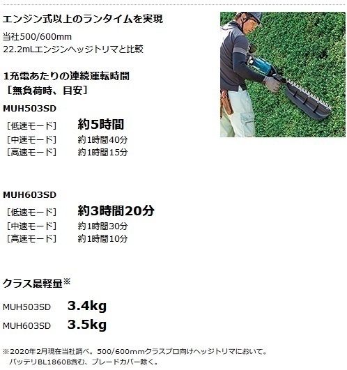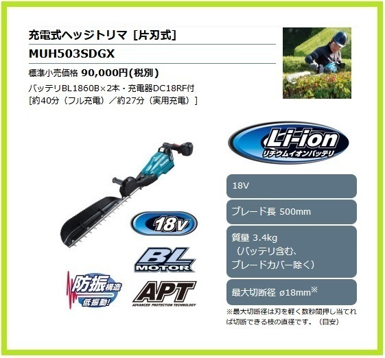 | MUH503SDGX | 953×282×143 | 3.4 | ブレードカバー チップレシーバ バッテリ(BL1860B)×2本 充電器(DC18RF) |