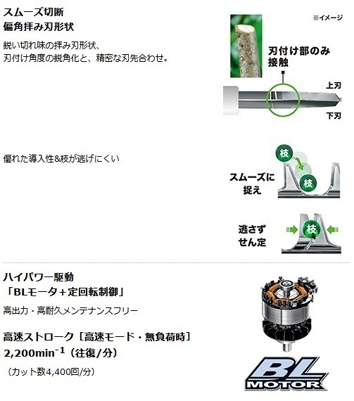 | ※1 刃を軽く数秒間押し当てれば切断できる枝の直径です。(目安) ※2 ブレードカバー除く。 ※3 連続運転時間は満充電における参考数値です。(無負荷時) | |||