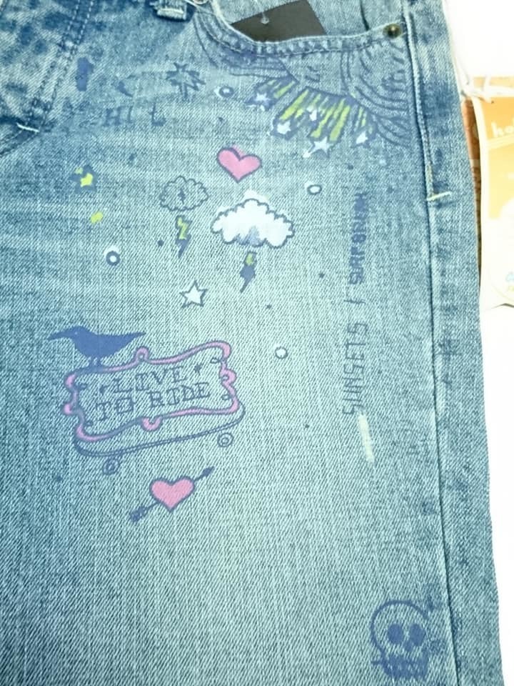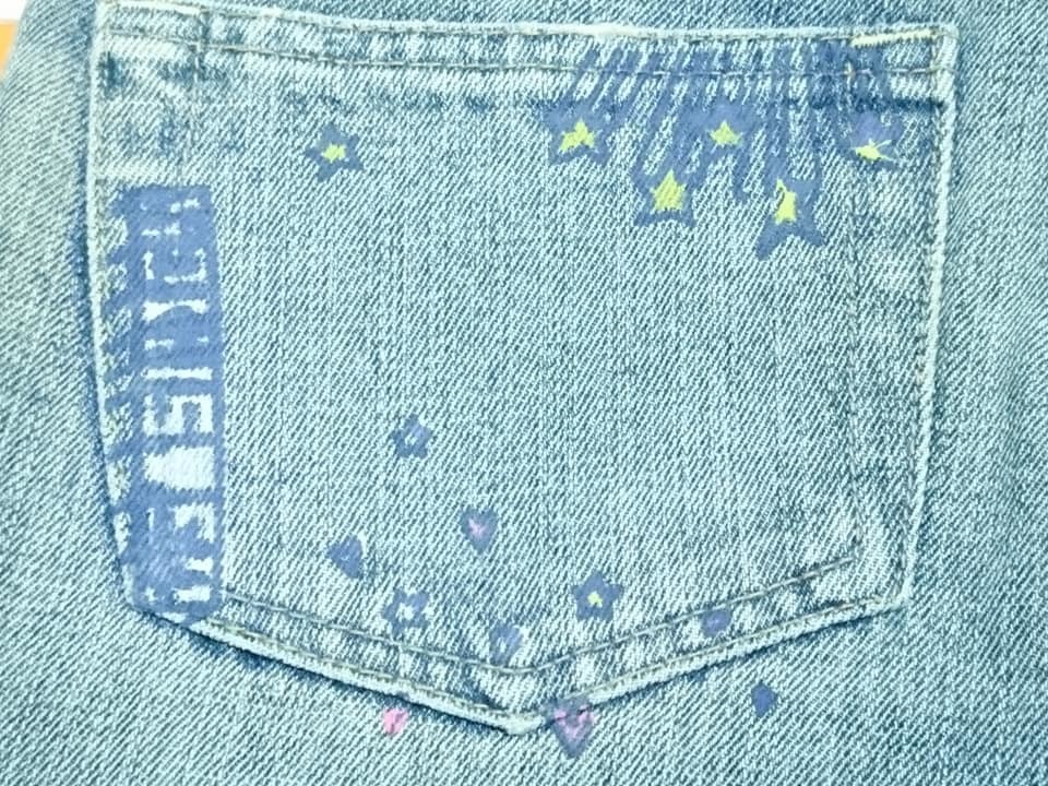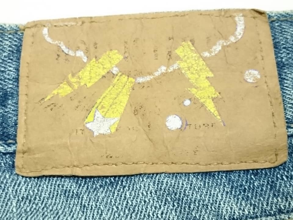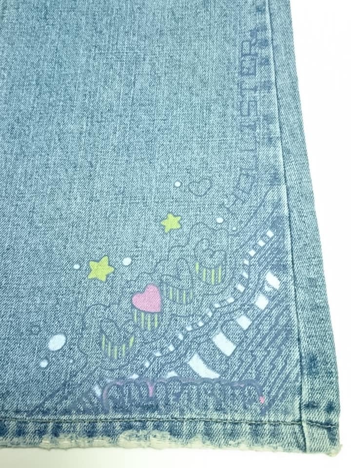 フロント左太もも、左足裾、左ヒップポケットにはポップなアート柄がプリント。