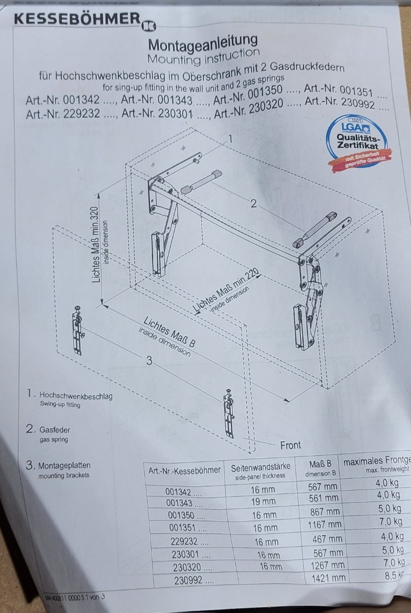 ウォールユニットのスイングアップフィッティング用、2 つのガス圧スプリング付き ウォールユニットのスイングアップフィッティング用、2 つのガススプリング付き 商品番号001342...、商品番号001343.... 商品番号001350...、商品番号001351...
