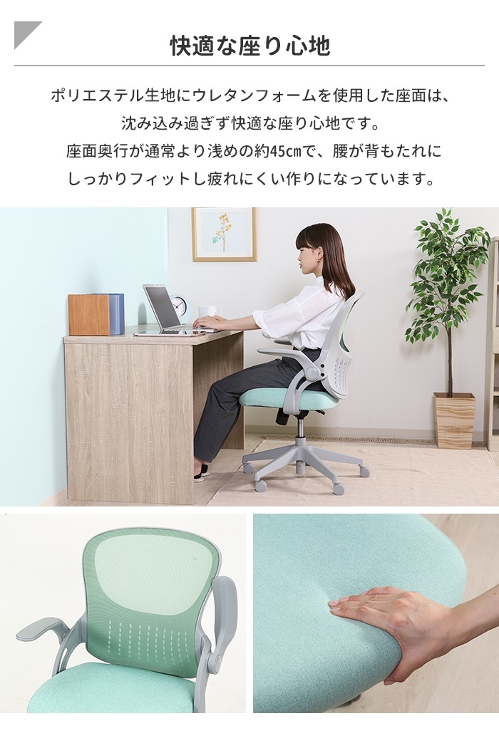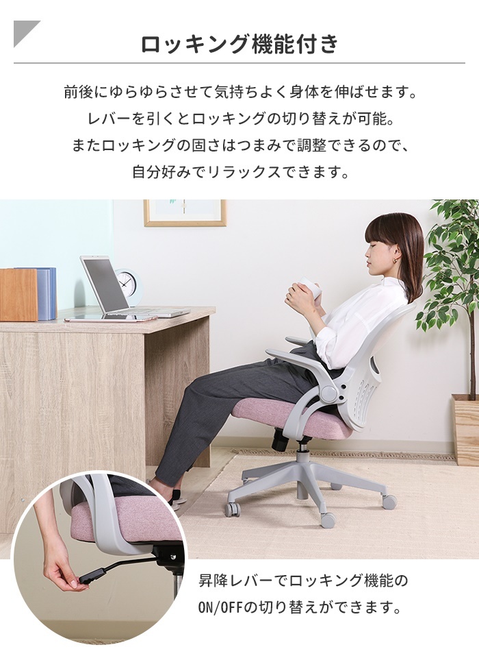| 女性のためにデザインされたコンパクトなオフィスチェア。 座面の奥行が通常より浅めの約45cmで、腰が背もたれにしっかりフィットし疲れにくい作りになっています。 座面にはポリエステル生地にウレタンフォームを使用し、沈み込み過ぎず快適な座り心地を実現。 レバーを引くとロッキングの切り替えが可能です。 またロッキングの固さはつまみで調整できるので、自分好みでリラックスできます。 肘掛けは上げ下げできるので、使わないときはアームを上げてデスク下にすっきり収納できます。 ガス圧昇降式で、無段階で高さ調整が可能。 座面の高さはお子様や女性でも使いやすい41~48.5cm。 |