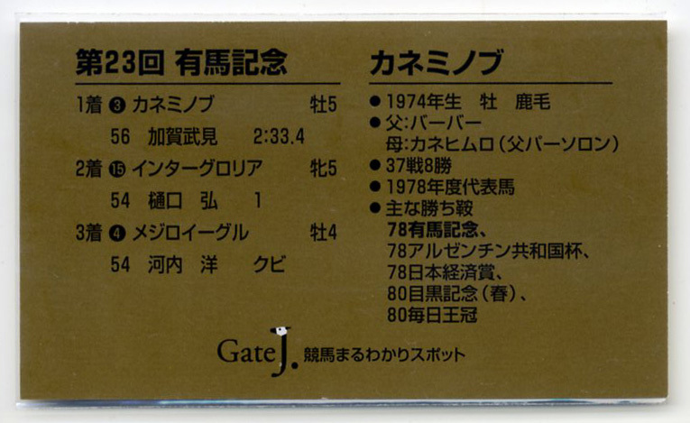 | ★非売品 カネミノブ 第23回有馬記念 単勝馬券型 カード JRA Gate J.名馬カード 加賀武見 写真 画像 競馬カード 即決 | |